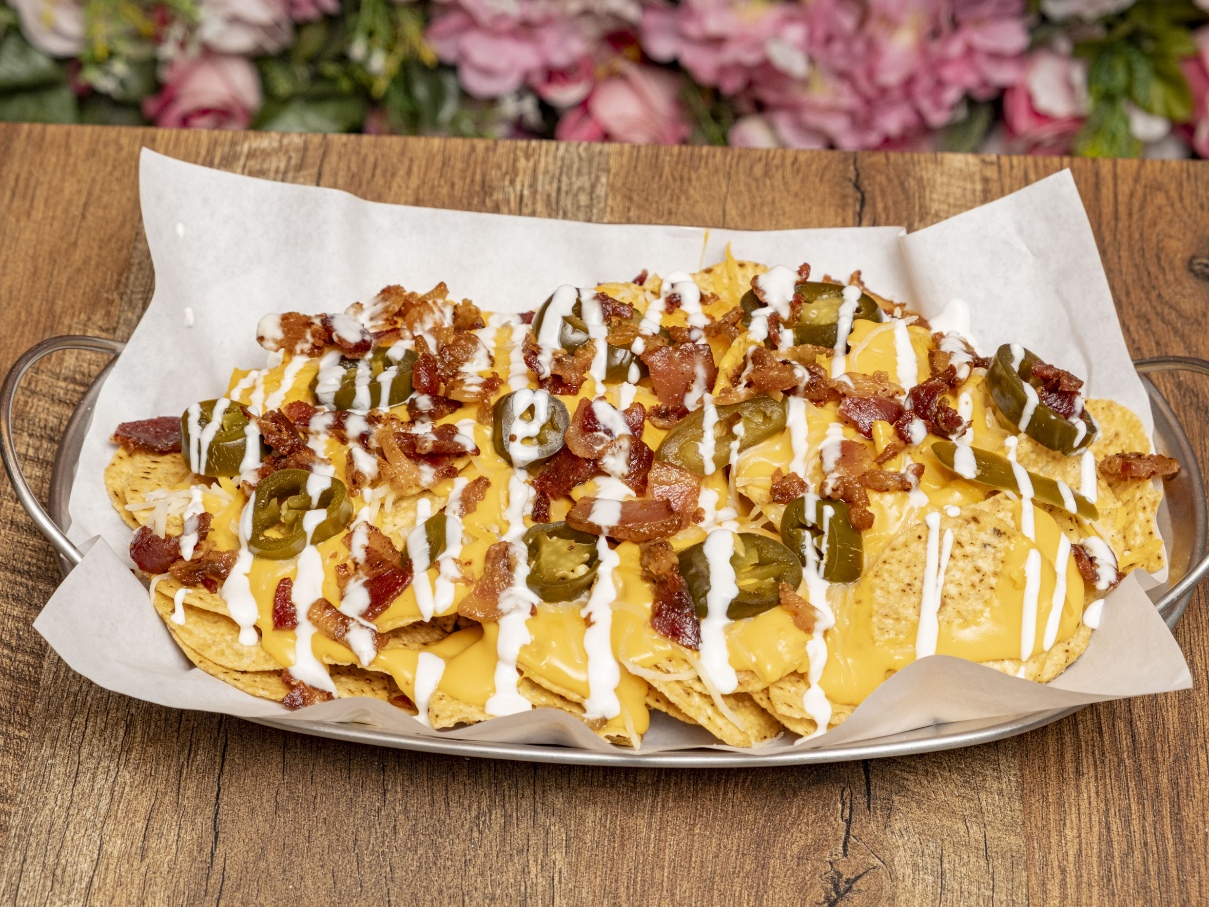Queso amarillo, queso rallado, crema agria, tocino y jalapeños.