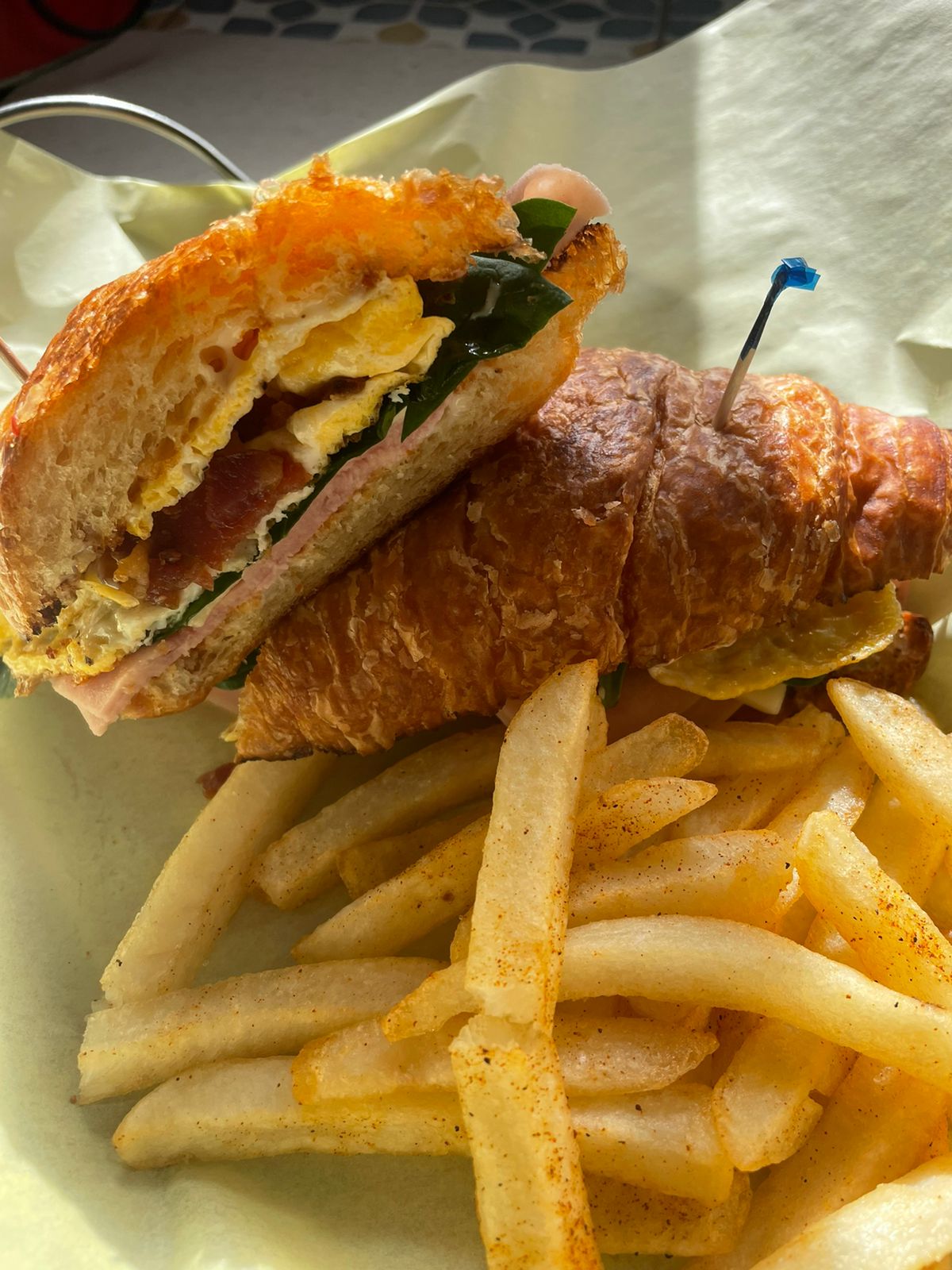 Jamón, huevo, tocino, espinaca y queso suizo, acompañado de papas fritas.