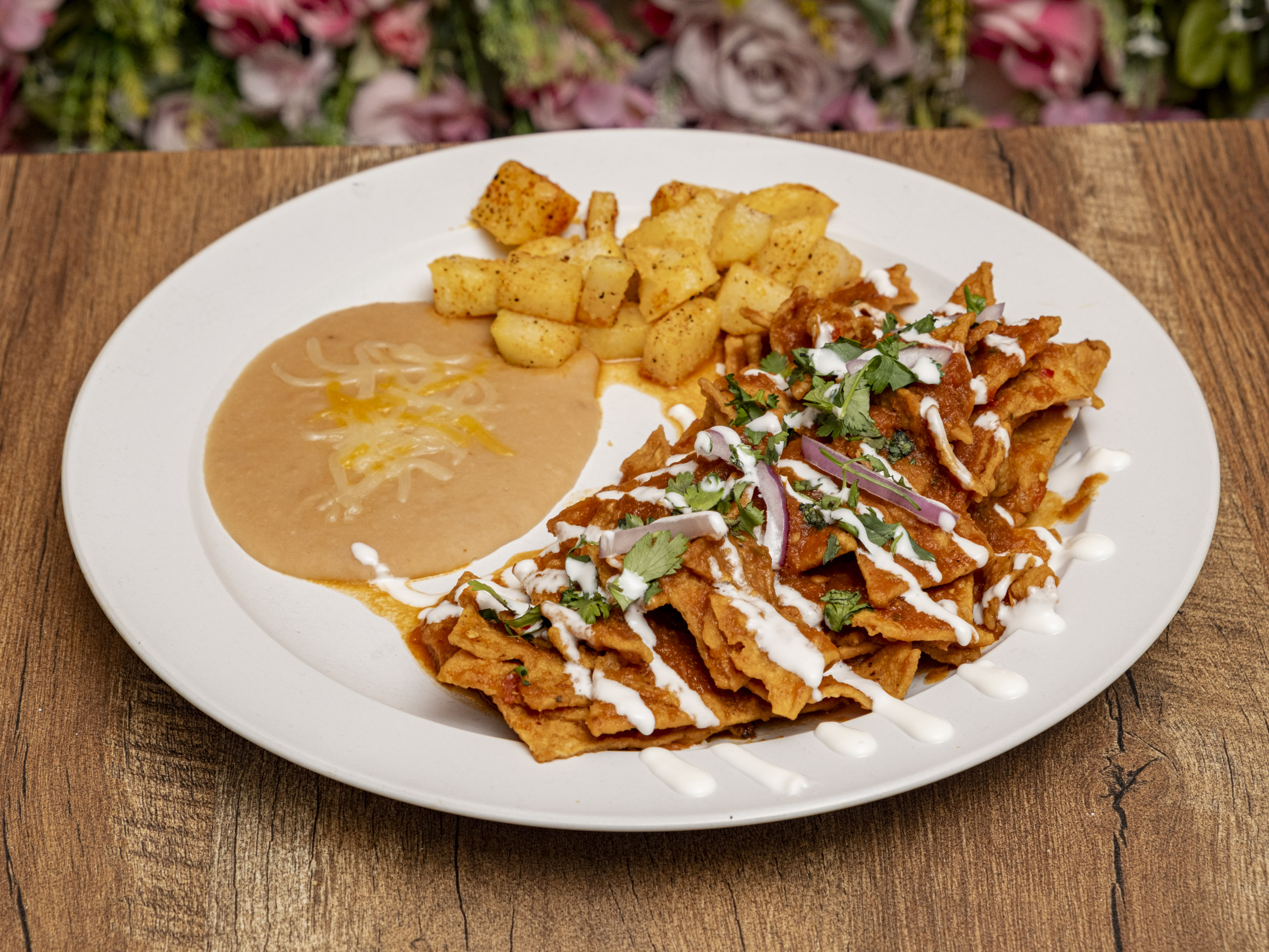 Queso y pollo, bañado en salsa roja o verde, decorado con cilantro, cebolla y aguacate, acompañado de papas y frijoles.
