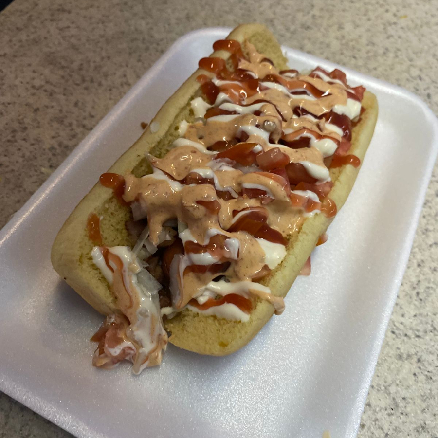 Tocino, tomate, cebolla, mayonessa, catsup, chipotle, papas con frijol y queso.