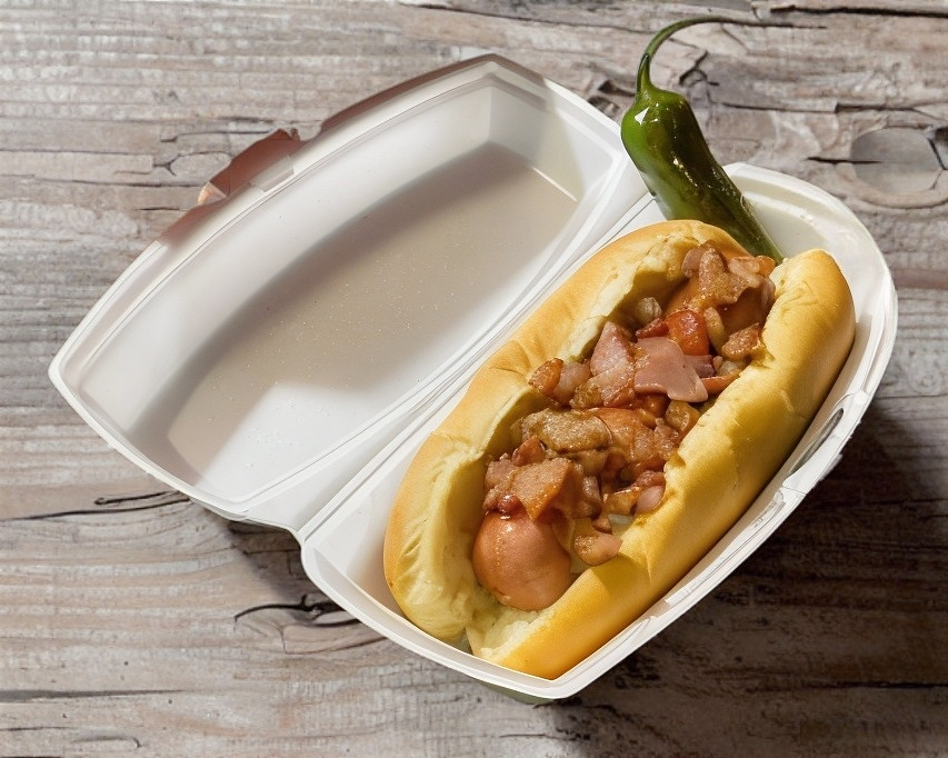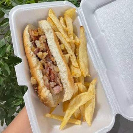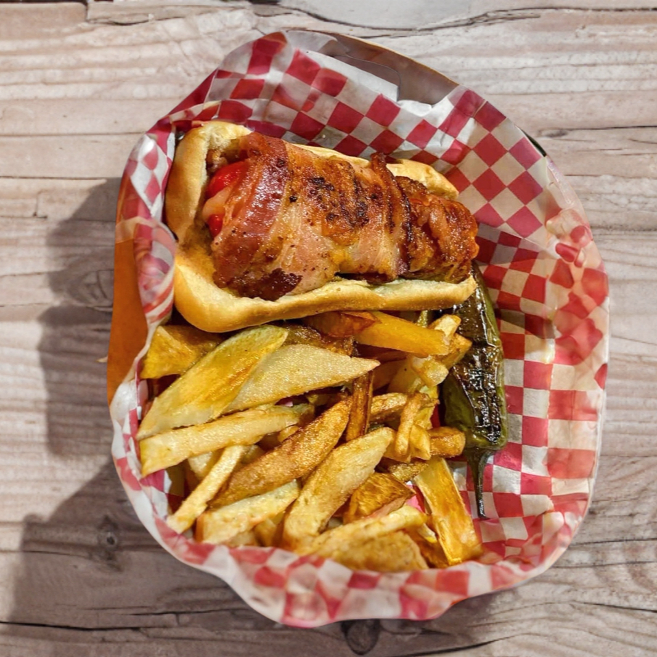 Pan Bimbo o de panadería a elegir, salchicha,tocino, acompañado de una porción de papas.