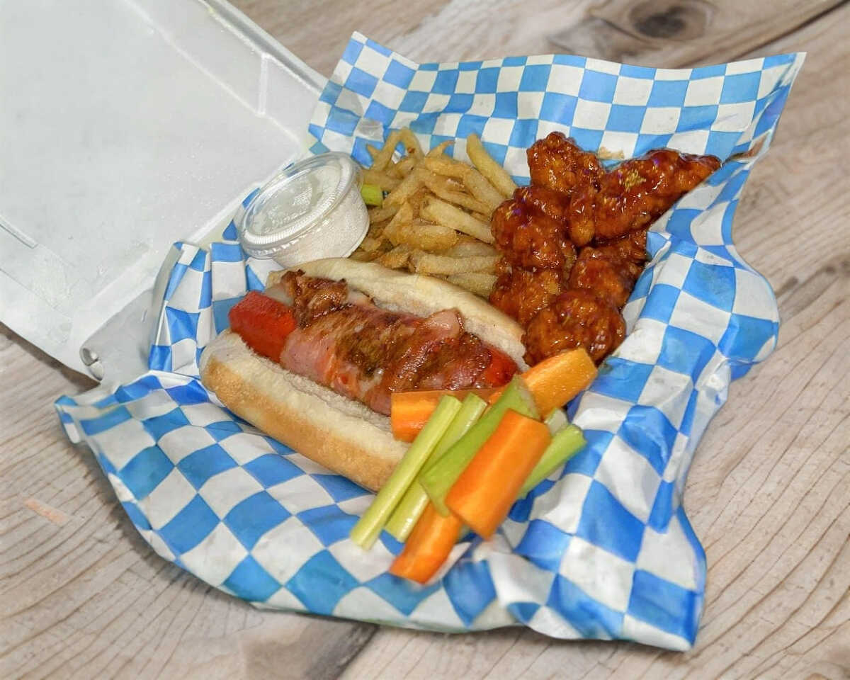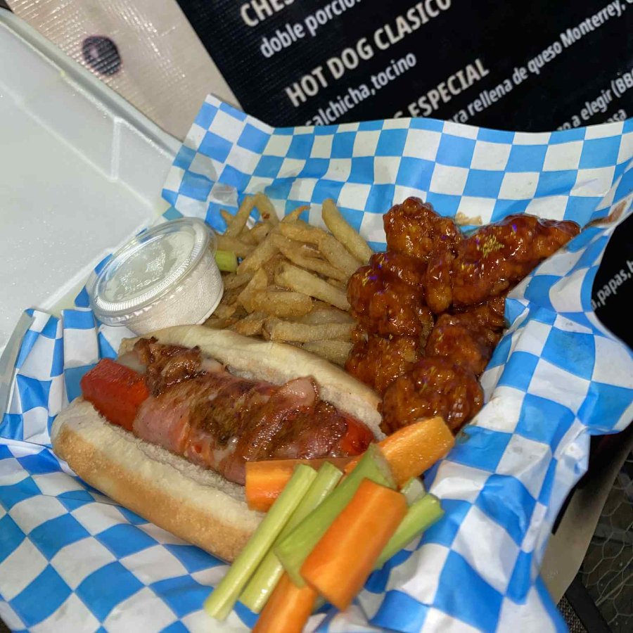 Hot dogs especial,papas , boneless bañados en aderezo BBQ, zanahoria, apio,y aderezo ranch