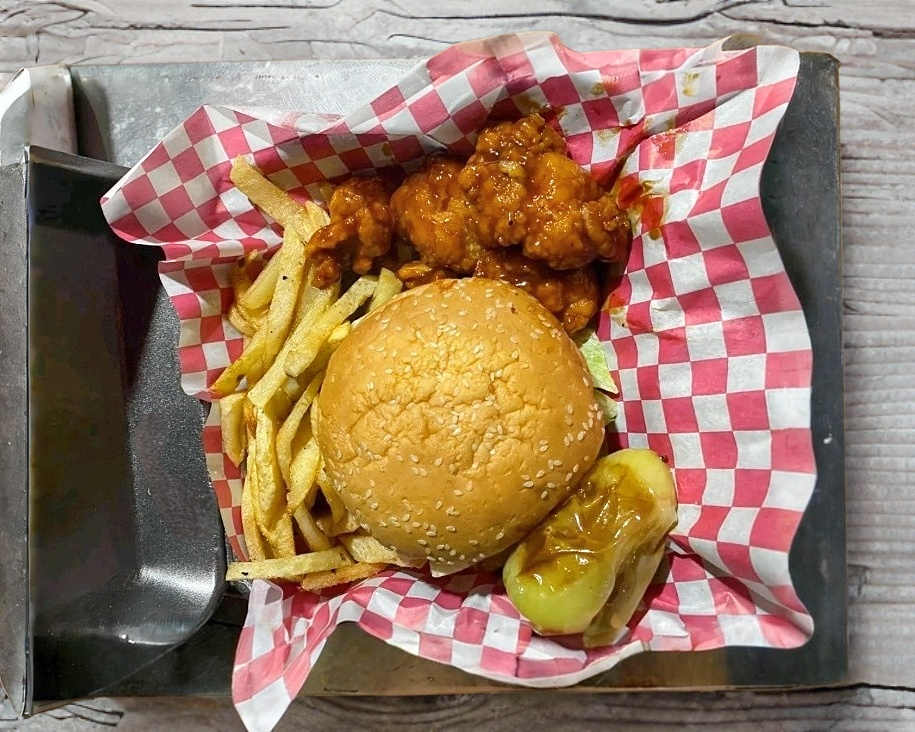 1 hamburgesa clasica + 1/2 orden de bonneles + papas a la francess + 1 agua de te