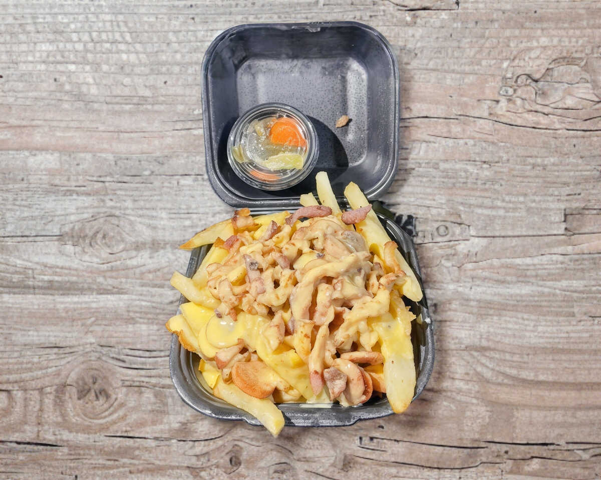 Carne,tocino,salchicha parrillera,jamón,queso amarillo, lechuga, tomate cebolla caramelizada mayonesa catsup, acompañada con papas