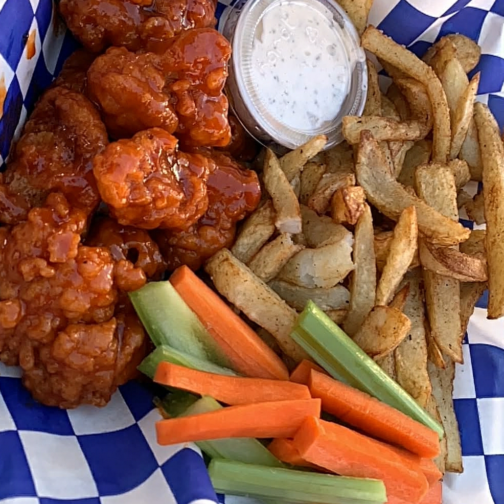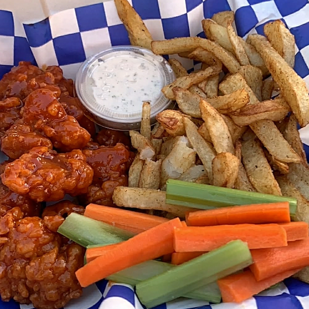 Carne,boneless bañados en salsa búfalo,lechuga, aderezo ranch acompañada de papas