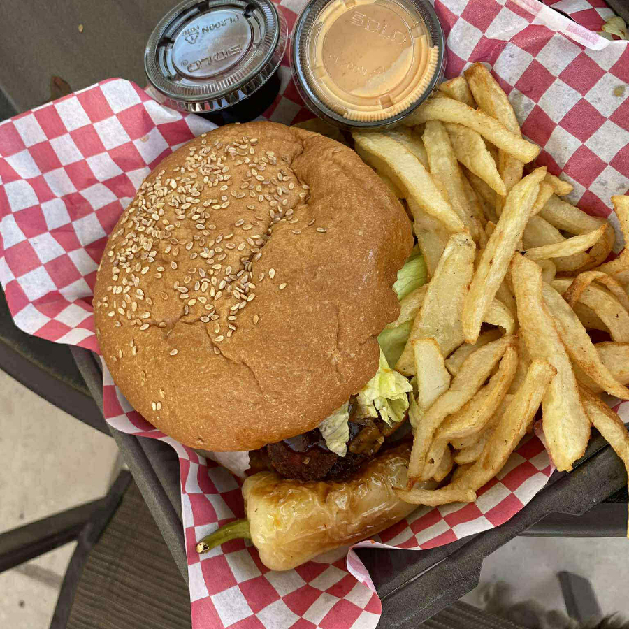 Doble porcion de carne y queso de hamburguesa,lechuga y cebolla acompañada de papas a la francesa