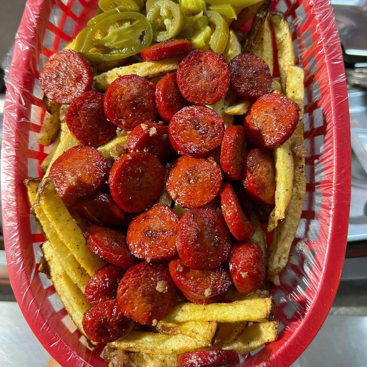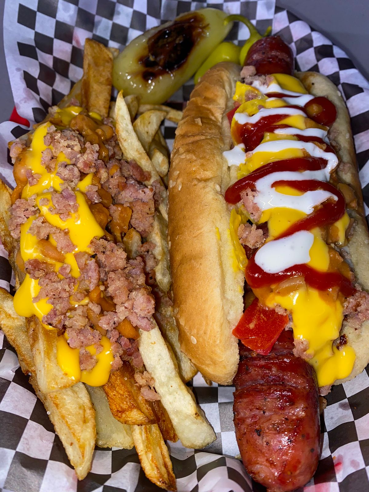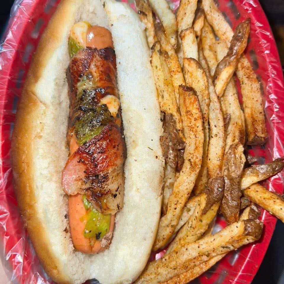 Hotdog con salchicha de pavo rellena con una mezcla de tres quesos, chile california y enrollado en tocino. Incluye papas sazonadas.