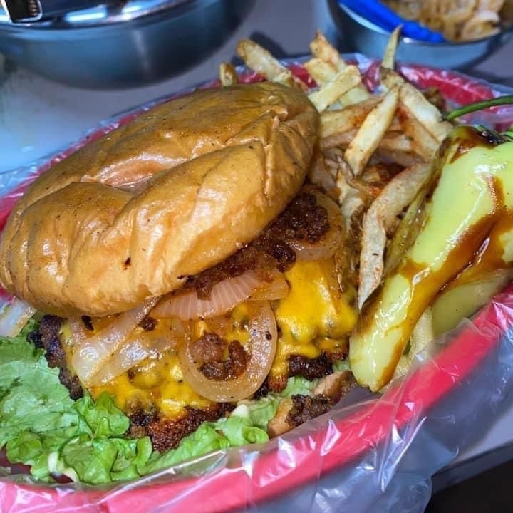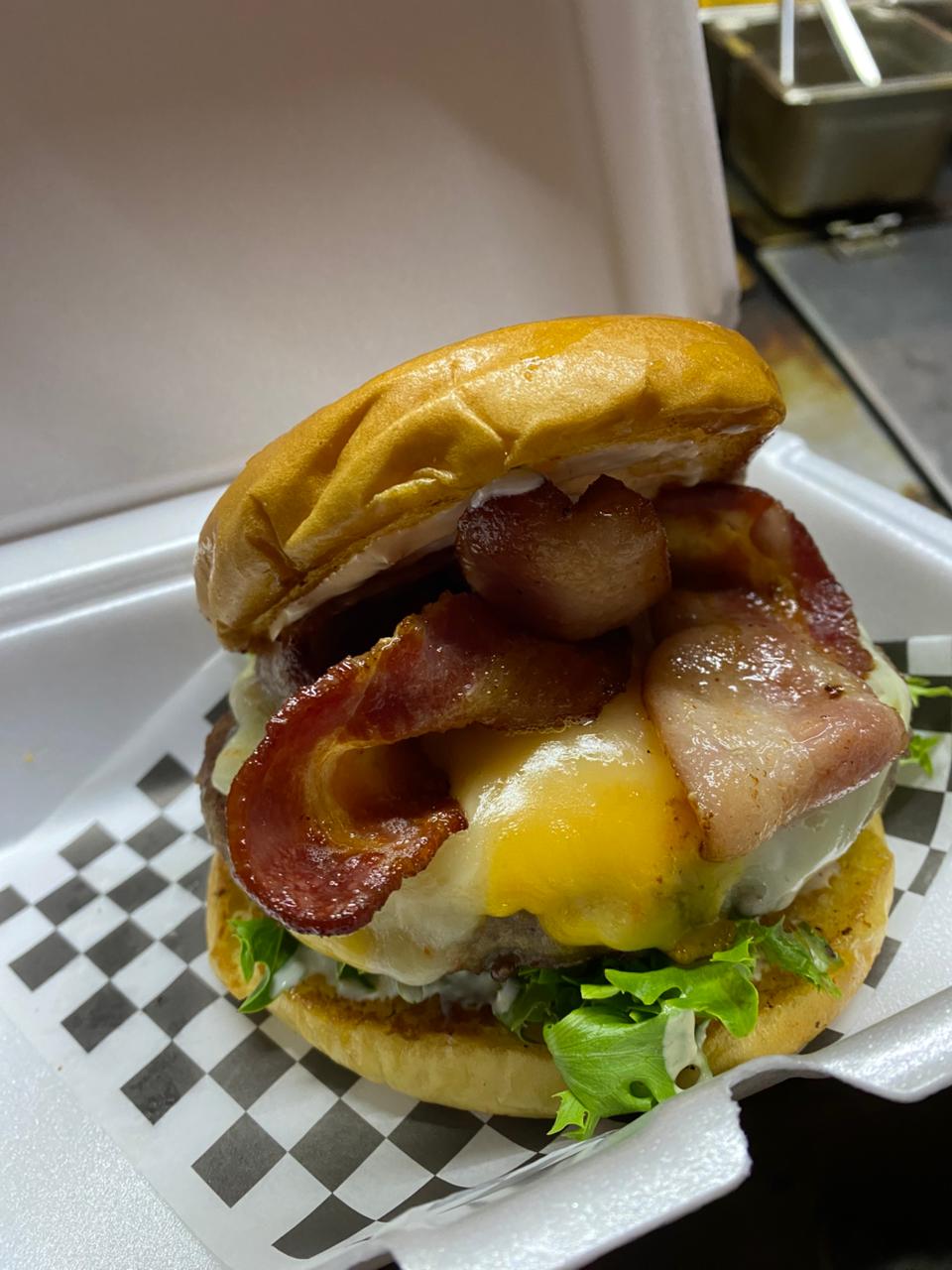 Hamburguesa con carne arrachera, tocino en tiras, una mezcla de tres quesos y lechuga. Incluye papas sazonadas.