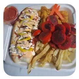 Hot dog salchicha de pavo, acompañado de nuestros deliciosos boneless 130grs y ademas porción de papas fritas, añada cada ingrediente que desee a su hot dog y elija la salsa de su gusto para los boneless asi como el aderezo para las papas fritas.