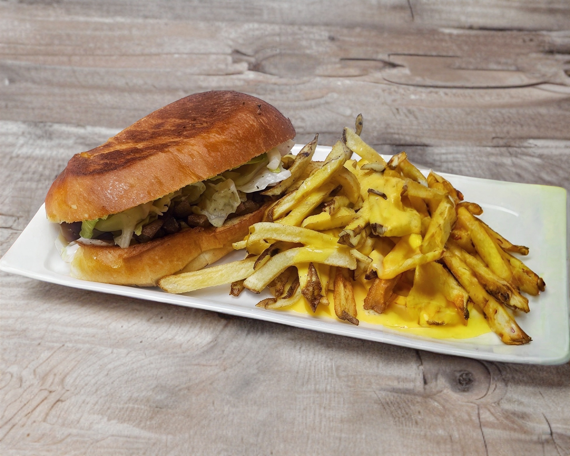 Torta de Carne Asada con Papas fritas(porcion personal ) , Lechuga, tomate, cebolla, aguacate y mayonesa.