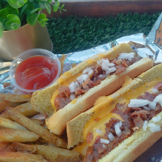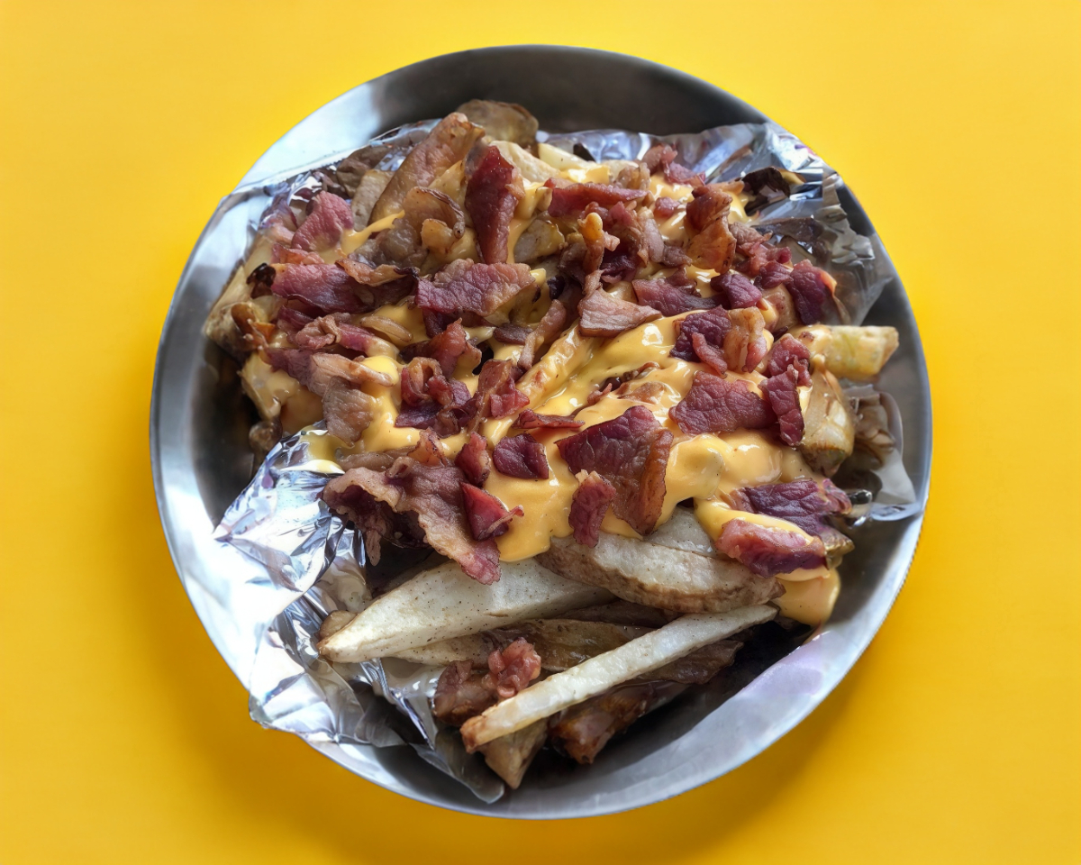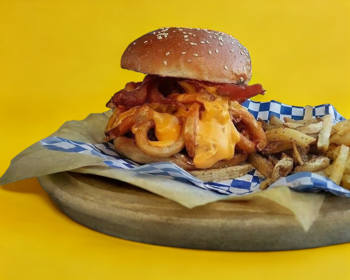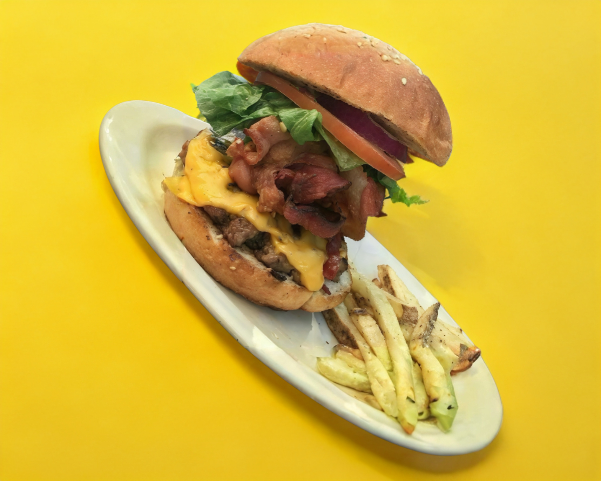100% Carne de res, doble tocino, queso americano, tomate, lechuga, cebolla.