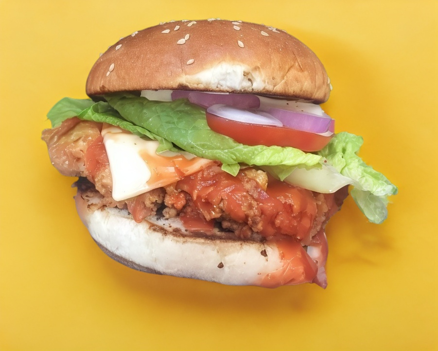 100% Carne de res, pechuga crujiente, queso suizo, tomate, lechuga, cebolla.