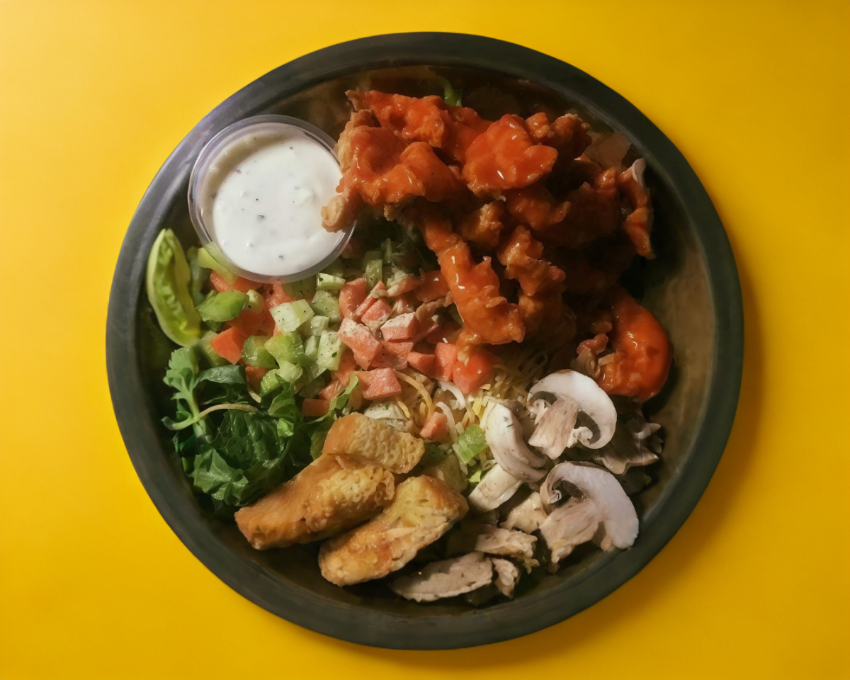 Lechuga romana, boneless de pechuga de pollo, apio, zanahoria, salsa de tu elección, aderezo ranch.