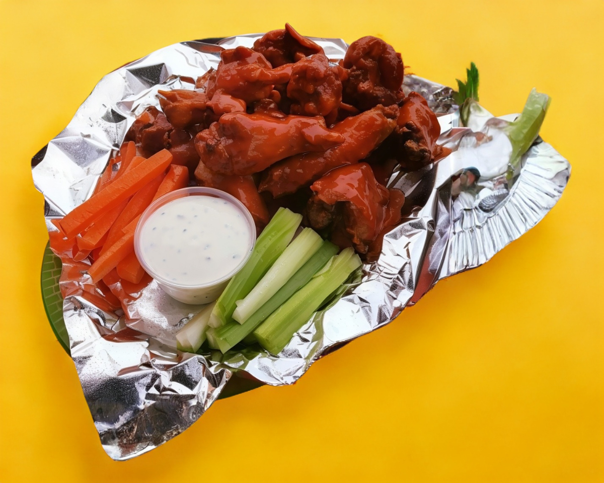Lechuga romana, alitas (250 g), apio, zanahoria, salsa de tu elección, aderezo ranch.