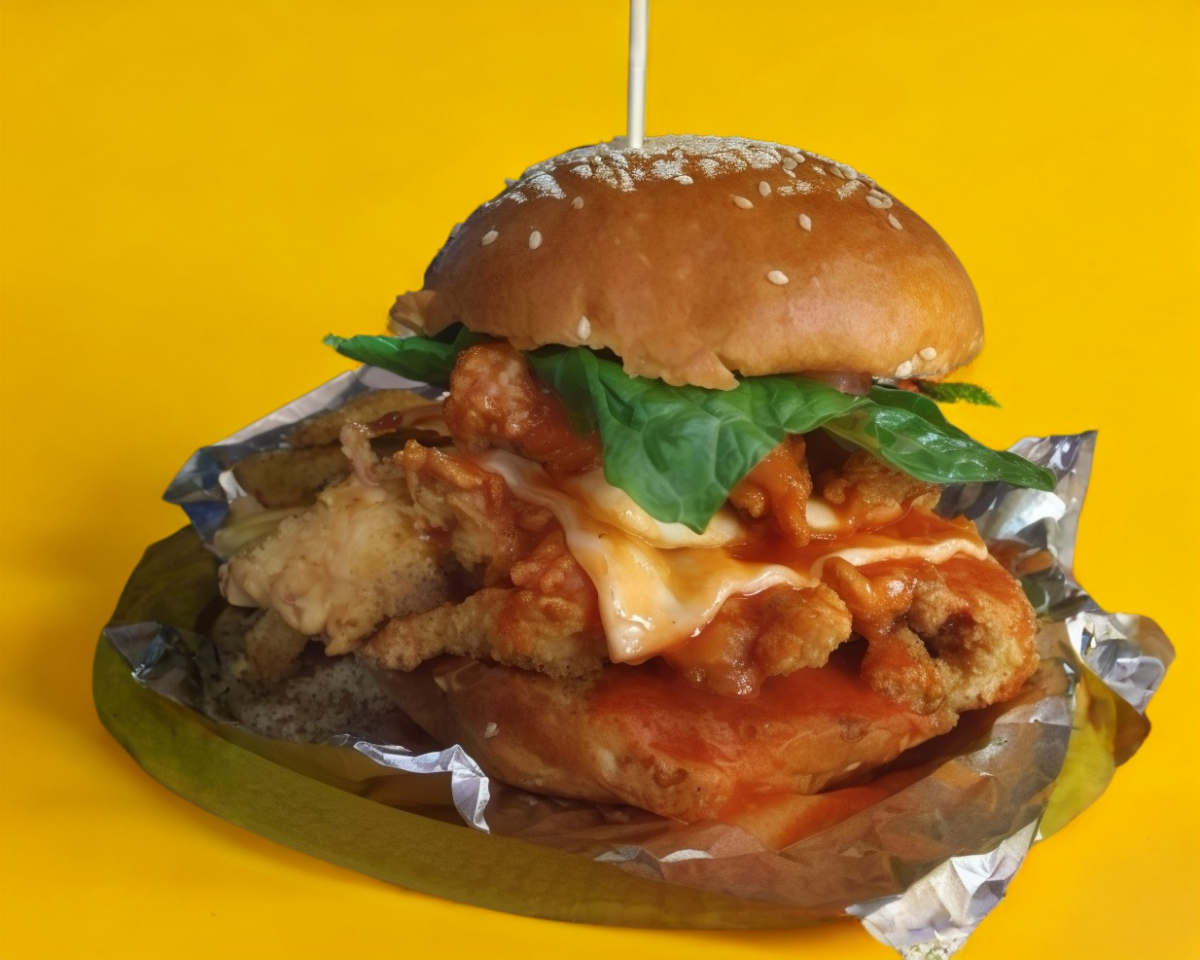 Boneless 100% de pechuga de pollo, salsa de tu elección, queso suizo, ranch, tomate, cebolla, lechuga.