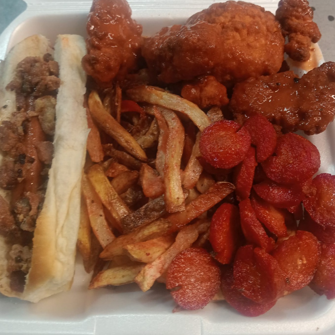 Incluye bubas, hot dog, papas y boneless con tomate, cebolla, tocino, cátsup y mayonesa.