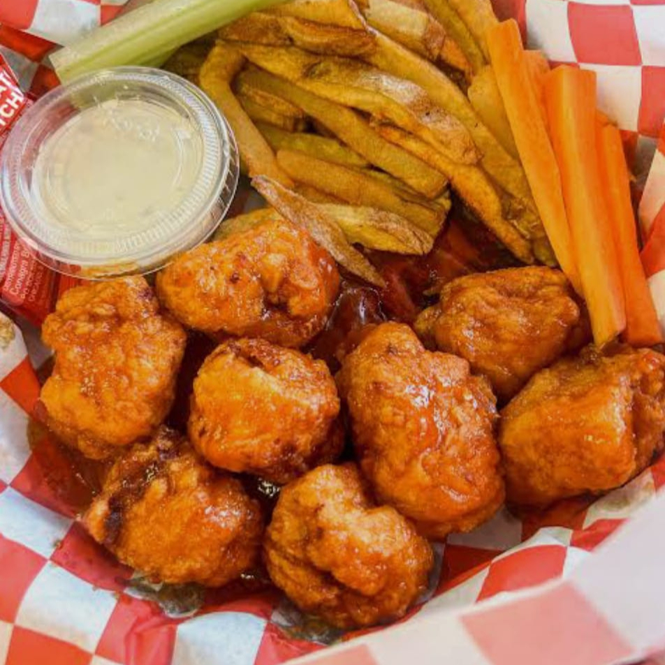 Porción de 500 g de boneless acompañados de zanahoria, apio, ranch y papas.