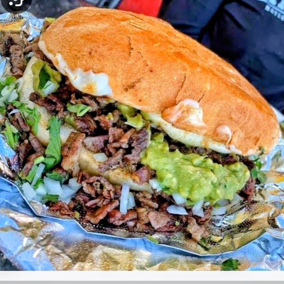 Torta de carne asada con lechuga, tomate, cebolla, mayonesa, queso manchego y aguacate.