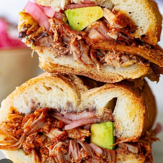 Torta de cochinita pibil con lechuga, tomate, cebolla, mayonesa, queso manchego y aguacate.