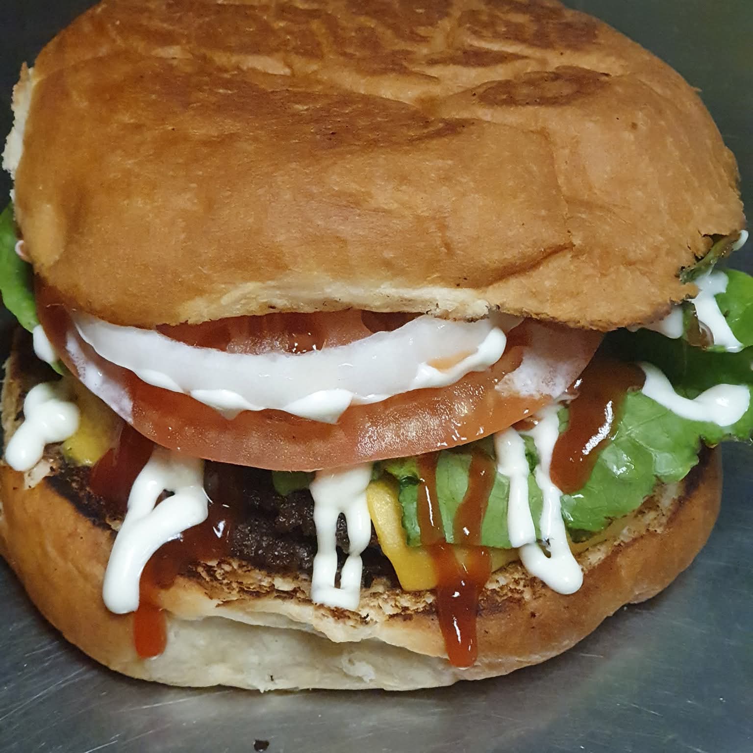 Carne de res, queso amarillo, tomate, cebolla, lechuga, cátsup y aderezo.