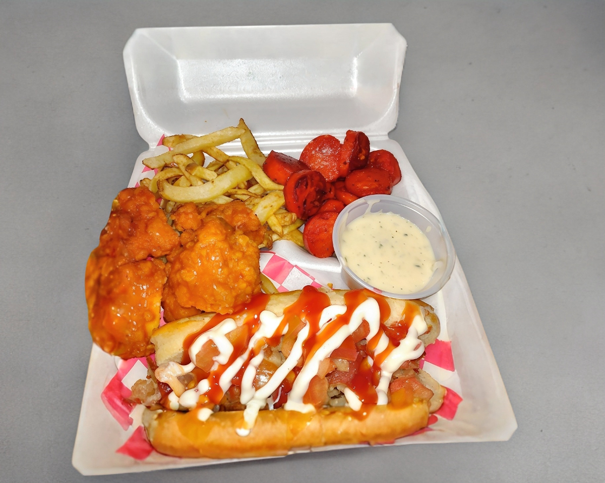 Dogo Fetuccini*1 + Porción de Papas Fritas*1 + Porción de Boneless Buffalo*1 + Porción de Bubas*1