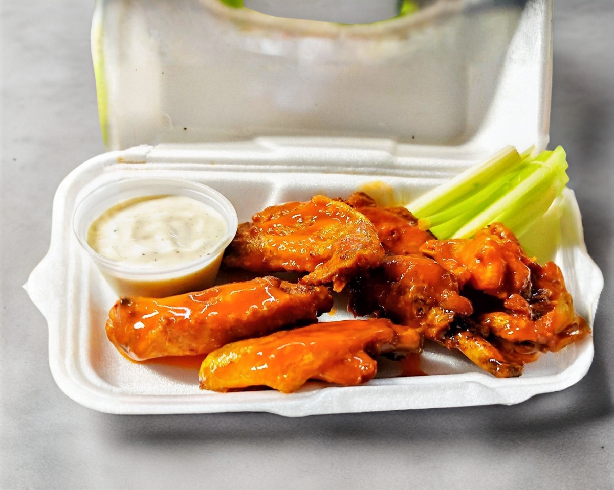 Orden de alitas bañadas en salsa búfalo acompañadas de aderezo ranch
