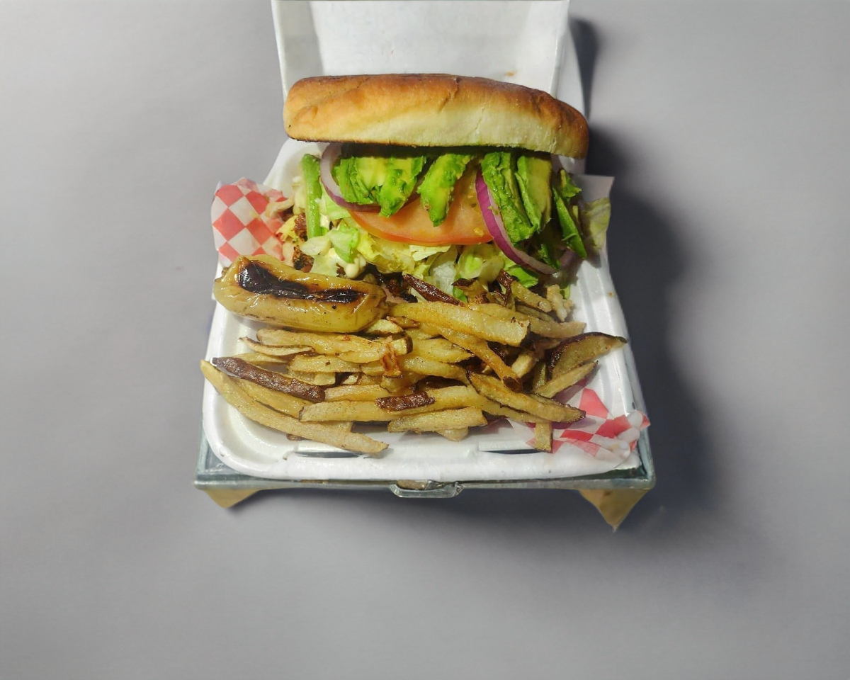 Bistec, verdura, mayonesa, aguacate y papas fritas