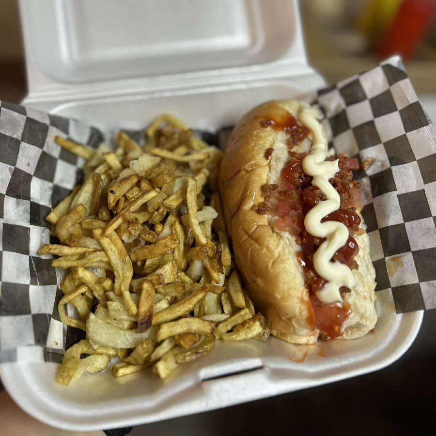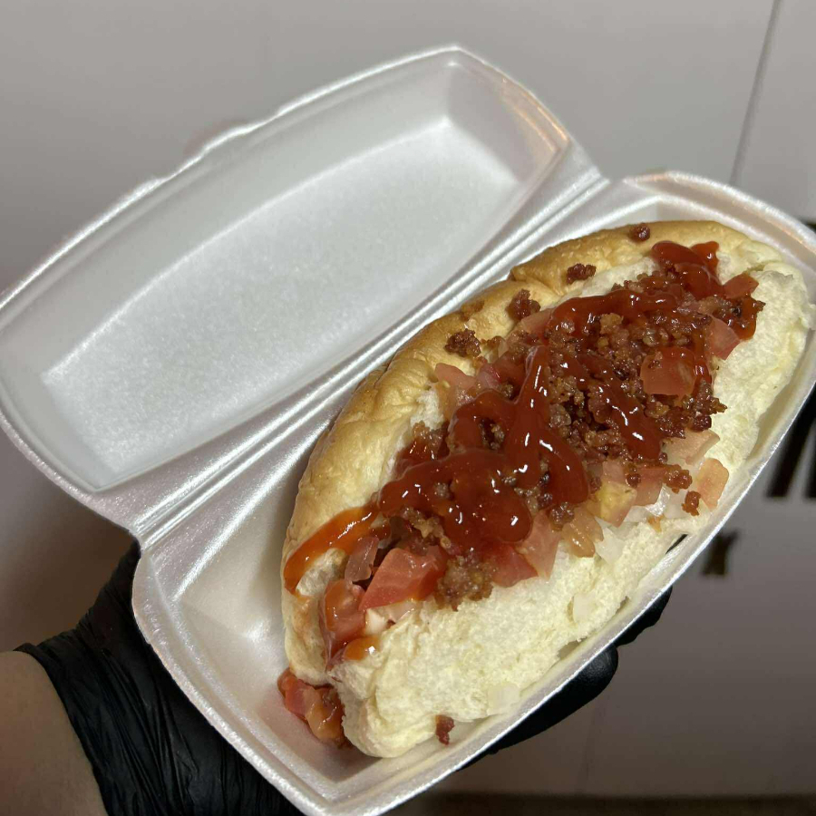 Pan de panaderia,salchicha,tocino,tomate,cebolla,champiñones,pepinillo,mayonesa,mostaza,chipotle y ketchup.