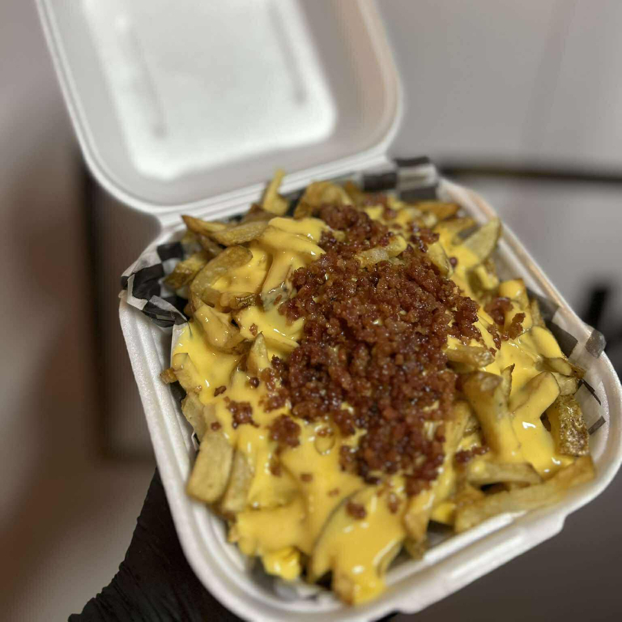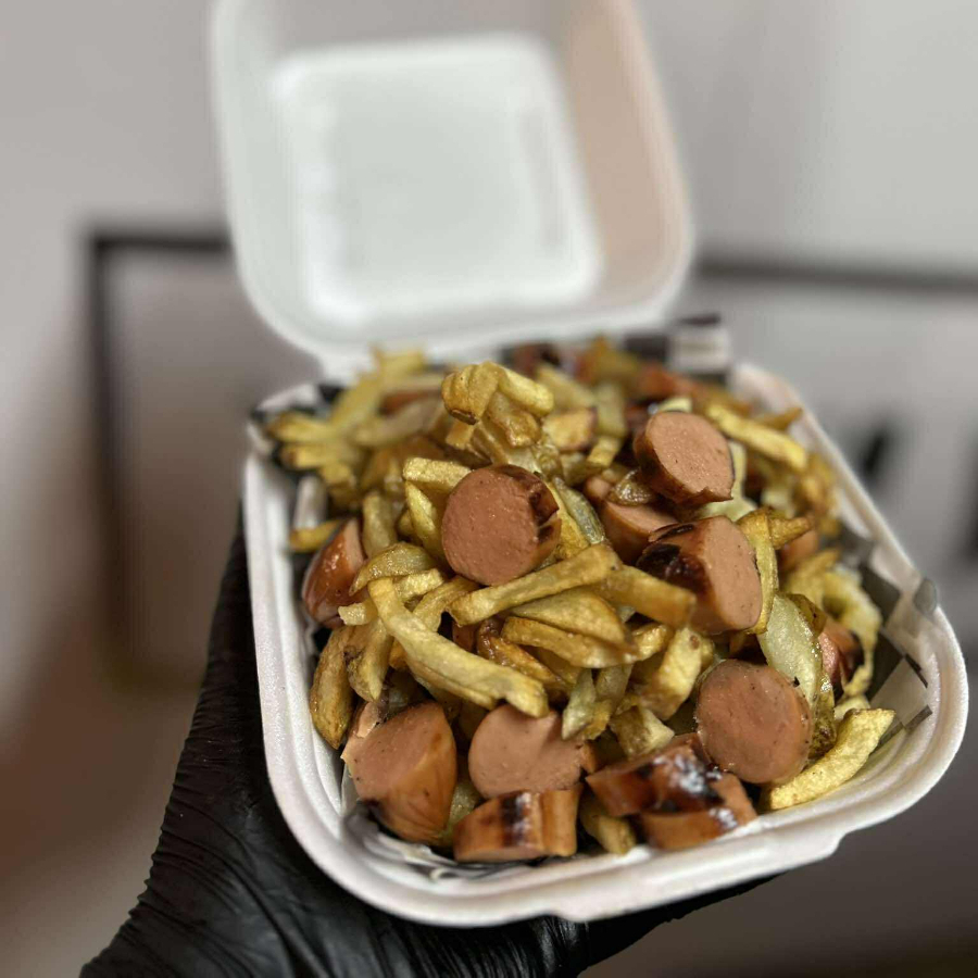 Papas,2 salchichas longmont,tocino y queso para nachos.
