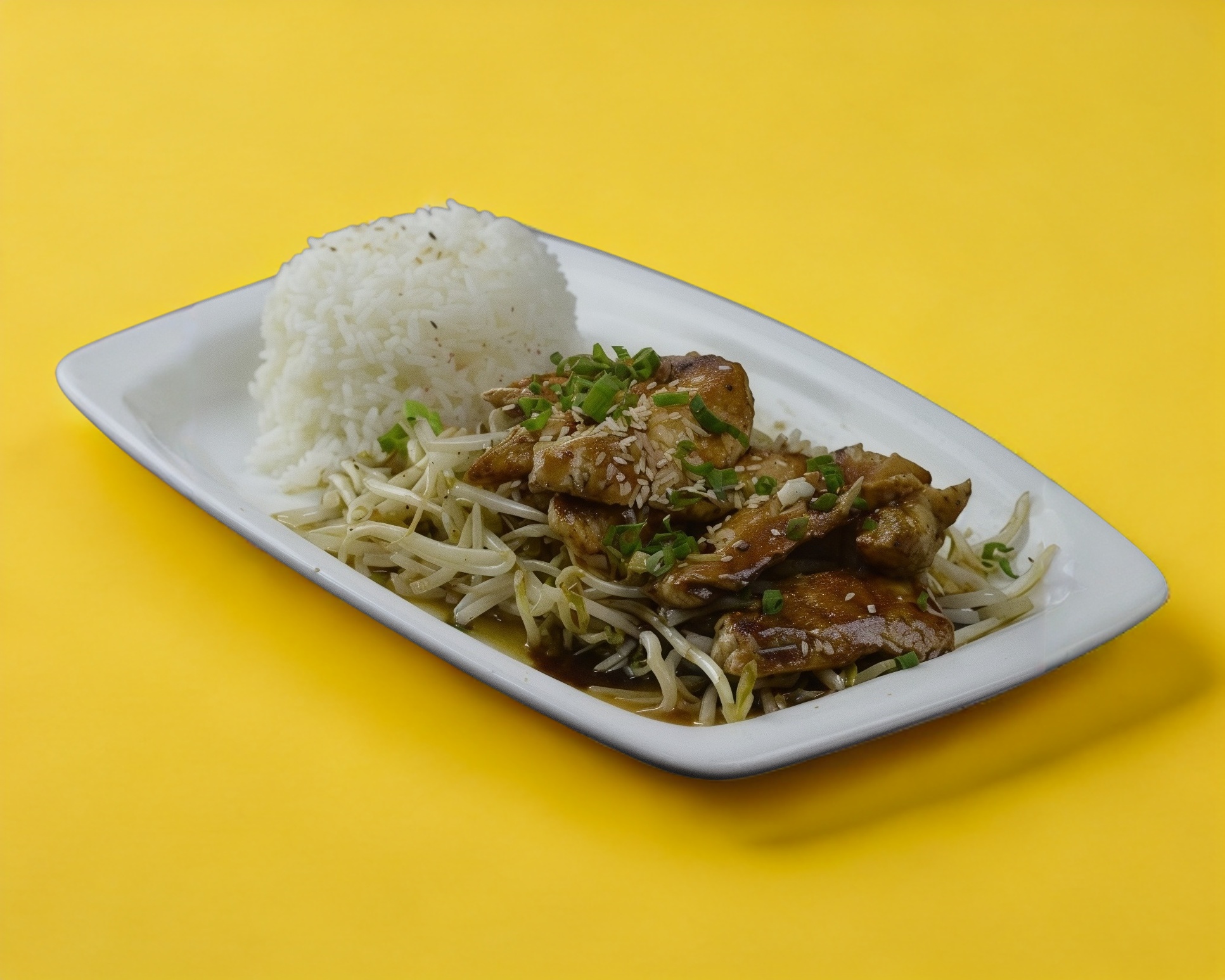 Pechuga a la plancha, cama de chop suey y guarnicion de arroz blanco