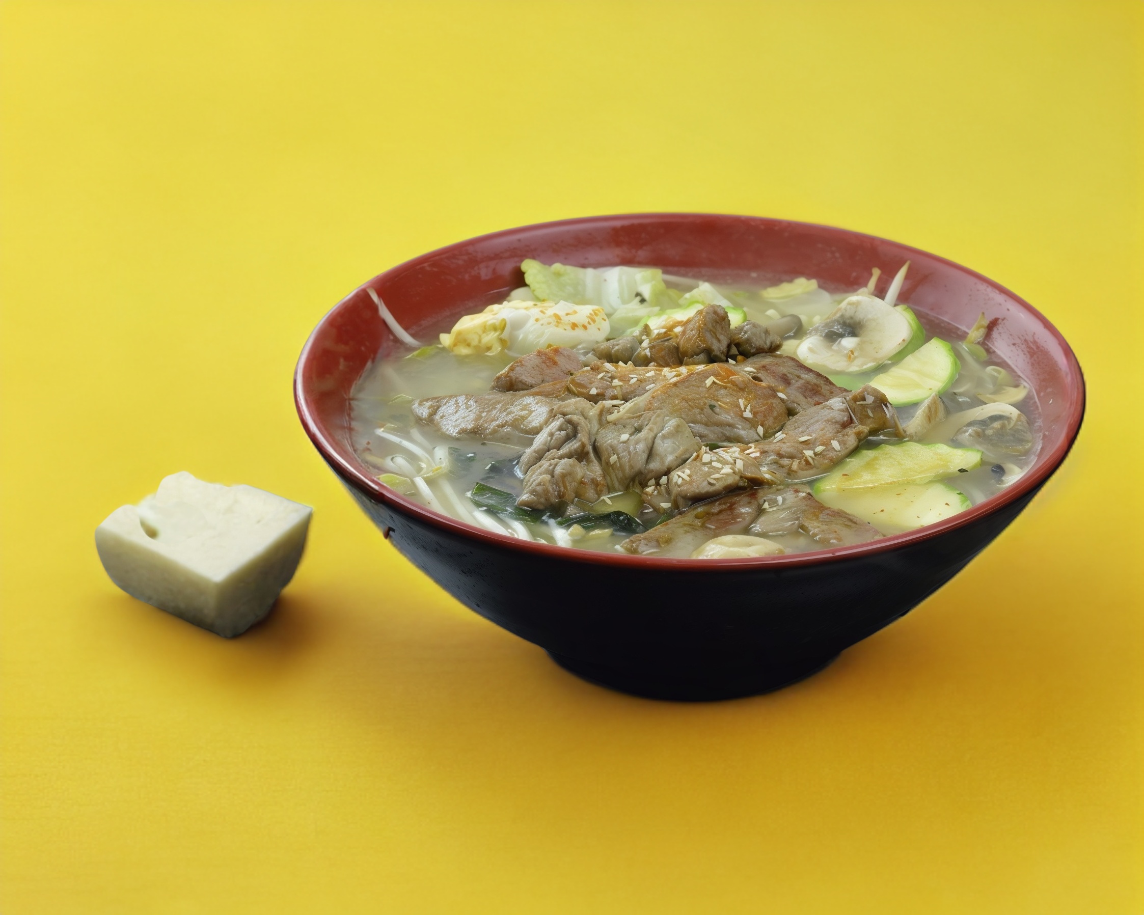 Fideos de ramen, shitake, champiñon, tofu, napa, calabaza, combinacion de verduras y esparrago