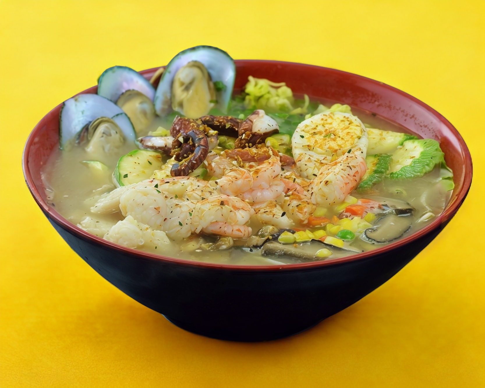 Fideos de Ramen, wakame, chop suey, huevo, combinacion de verduras, mejillon, calamar, camaron, surimi, pulpo y pescado