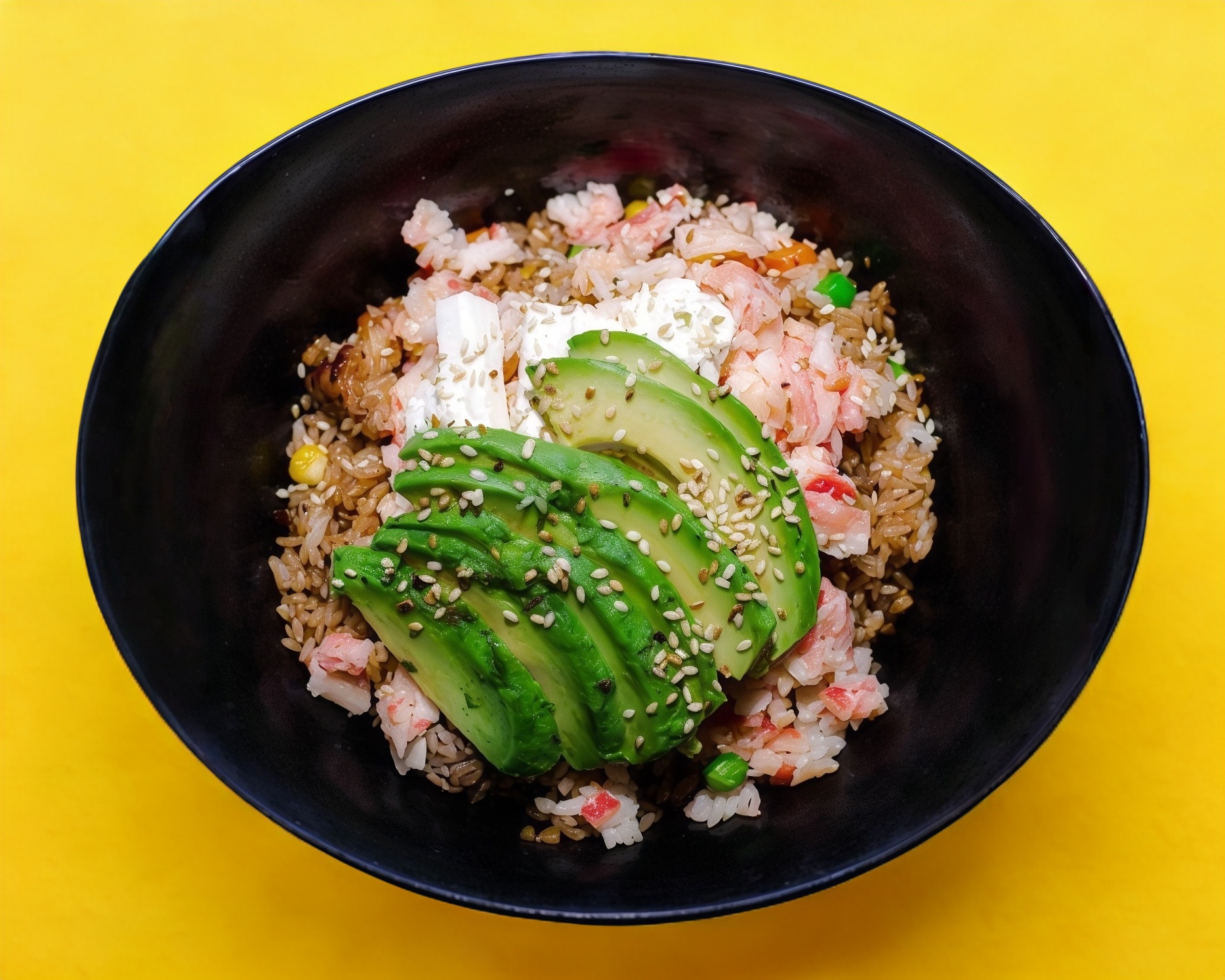 Arroz Frito con verduras mixtas, pollo y arrachera, surimi, queso crema y aguacate