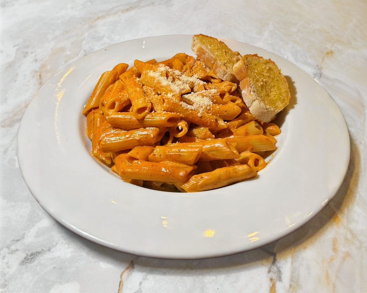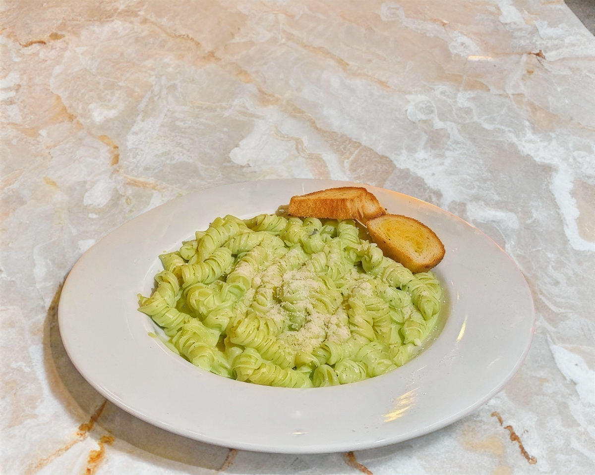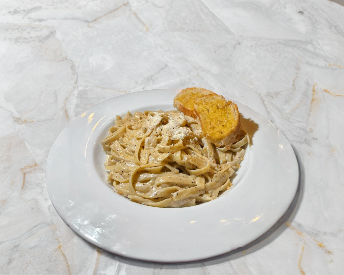 Salsa tipo Alfredo base crema de champiñon, condimentos y acompañado de una porcion de pan de ajo.