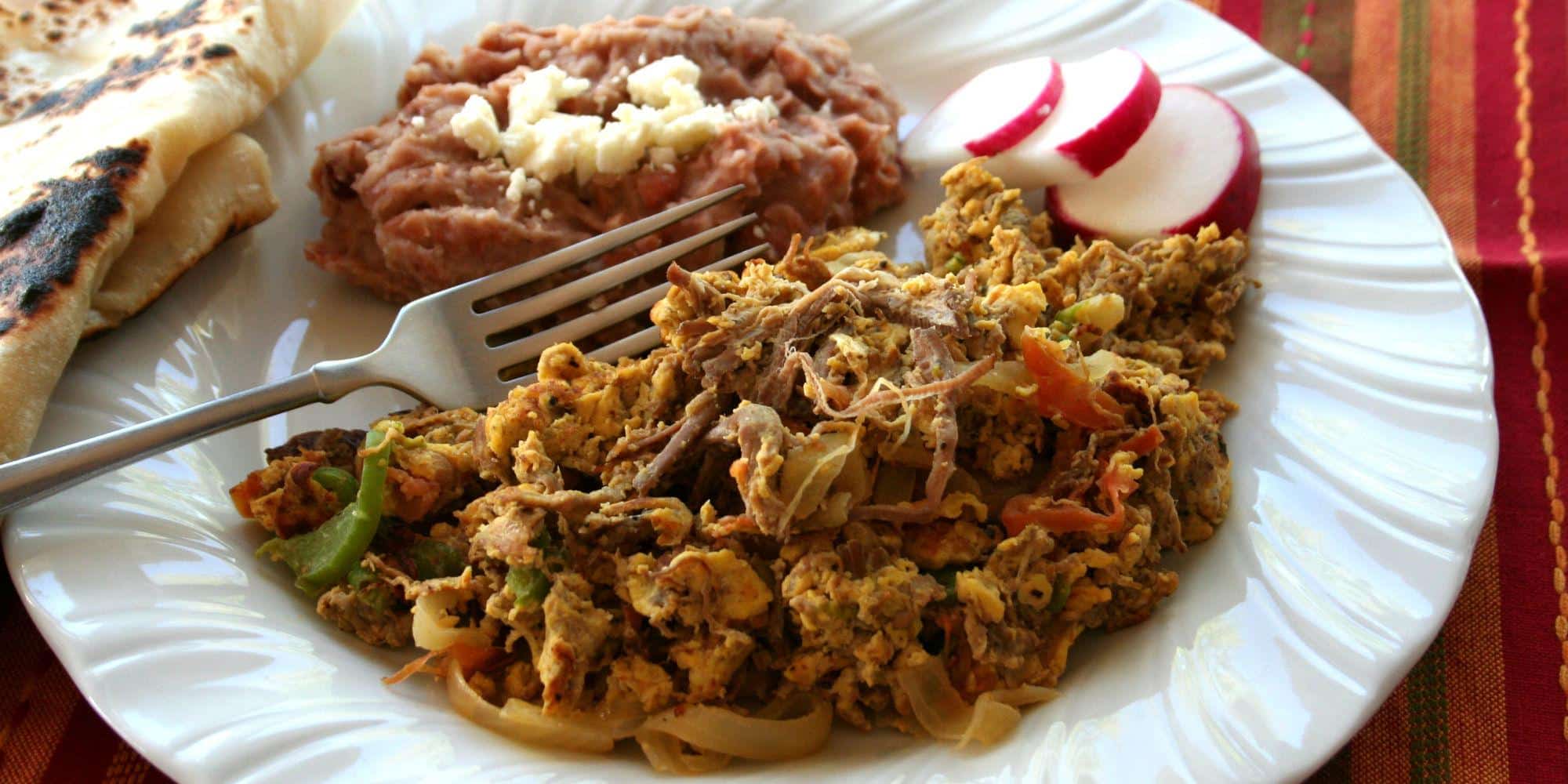 Huevito con machaca, acompañados de frijolitos con tortilla de maiz o harina o pan tostado + Bebida