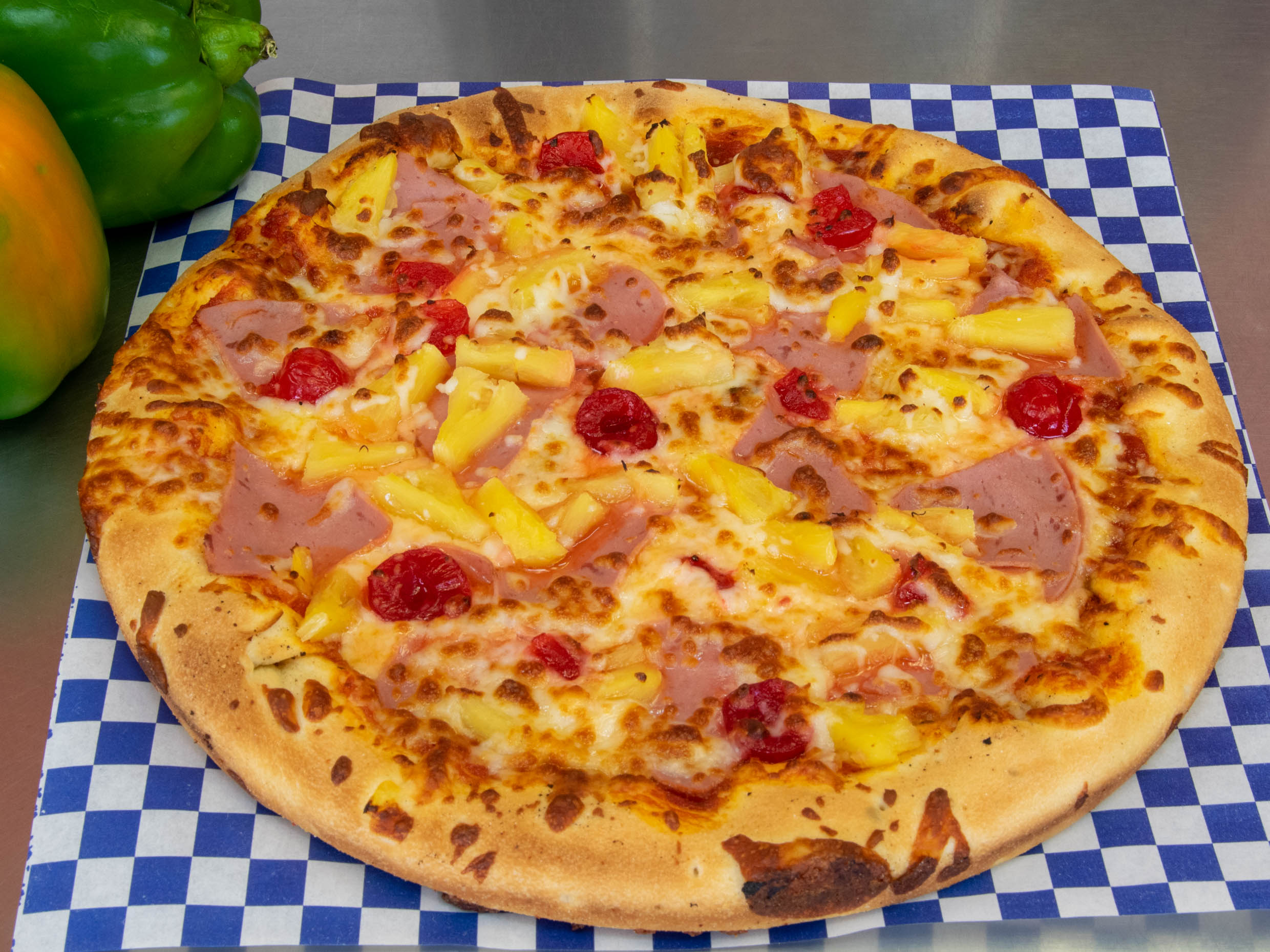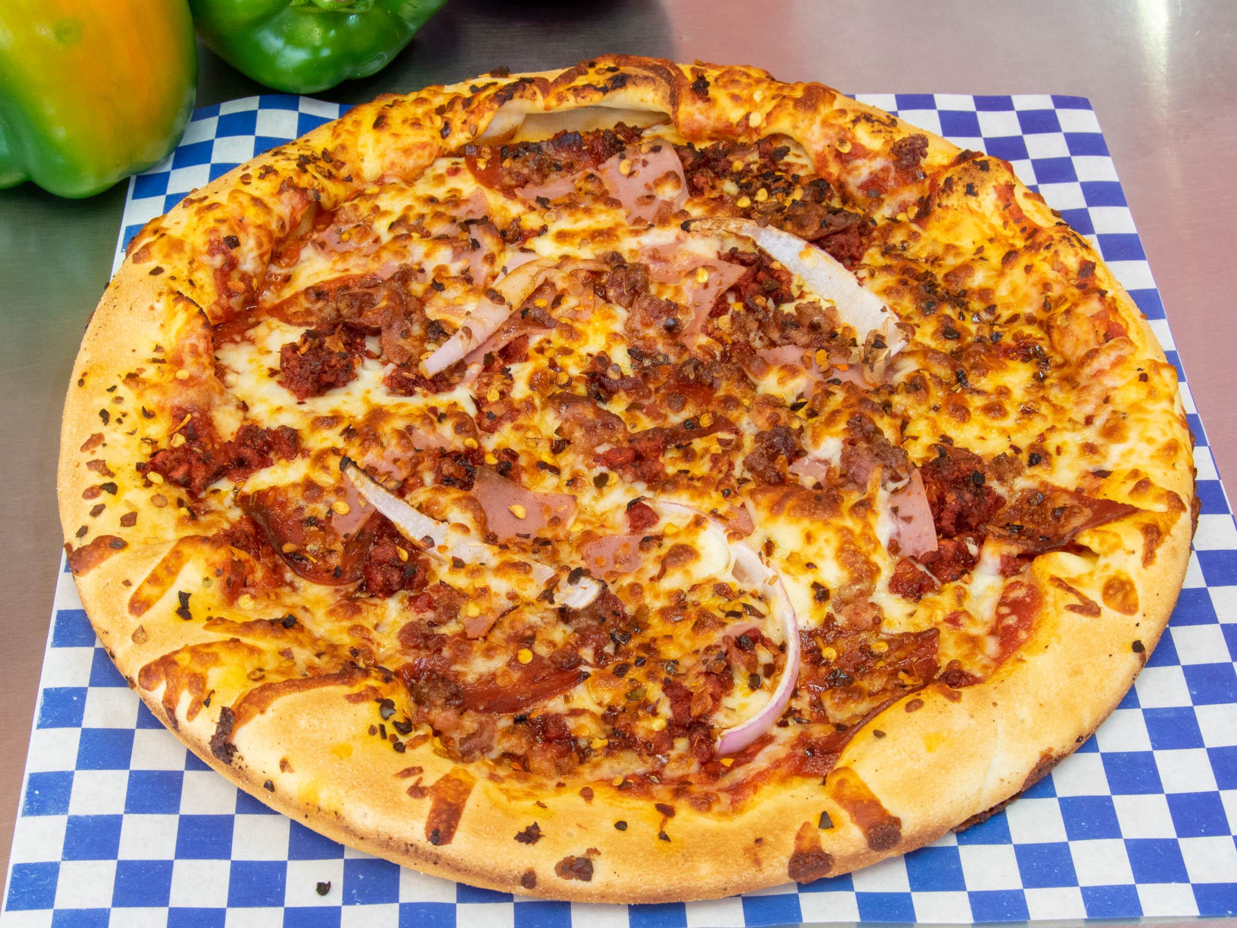 Pizza tamaño mediana, jamón de pierna, carne de res, chile jalapeño, chorizo ranchero, cebolla y champiñones.