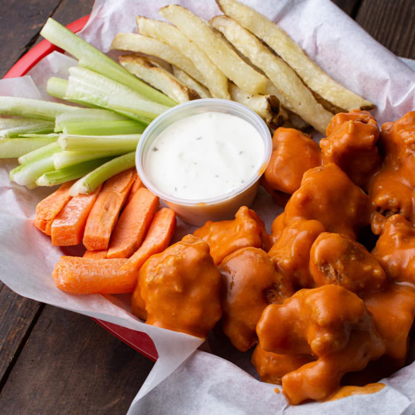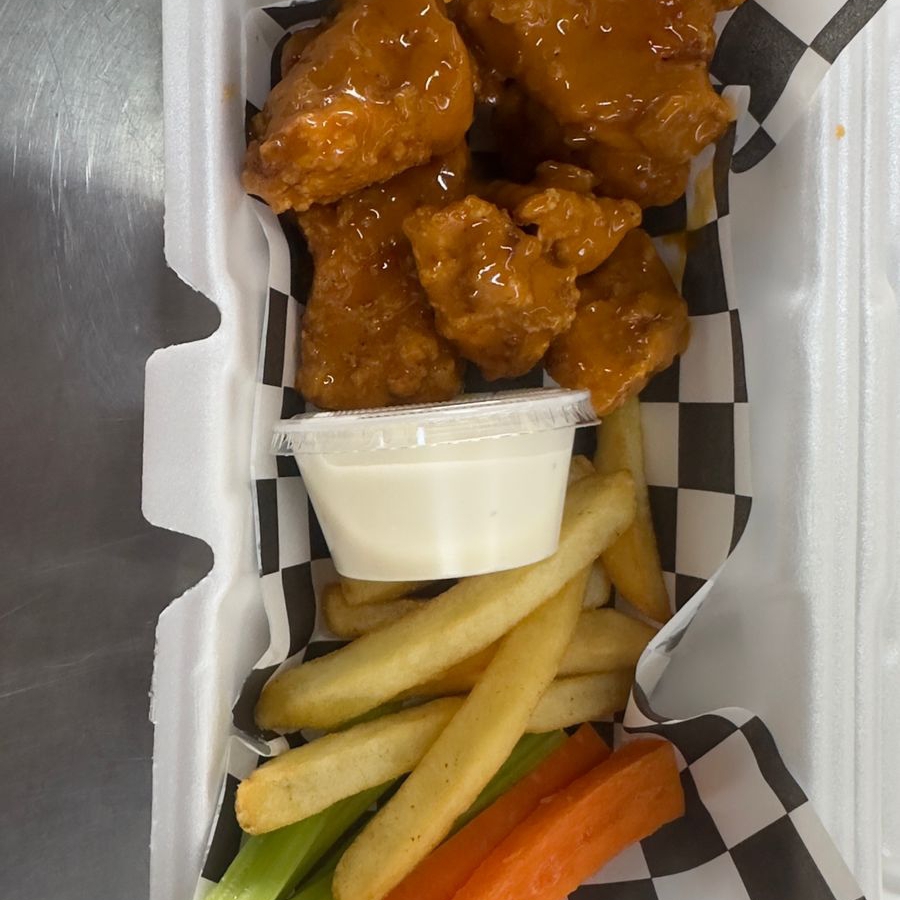 7 piezas de boneless bañados en tu salsa preferida, acompañados con papas fritas, zanahoria y apio.
