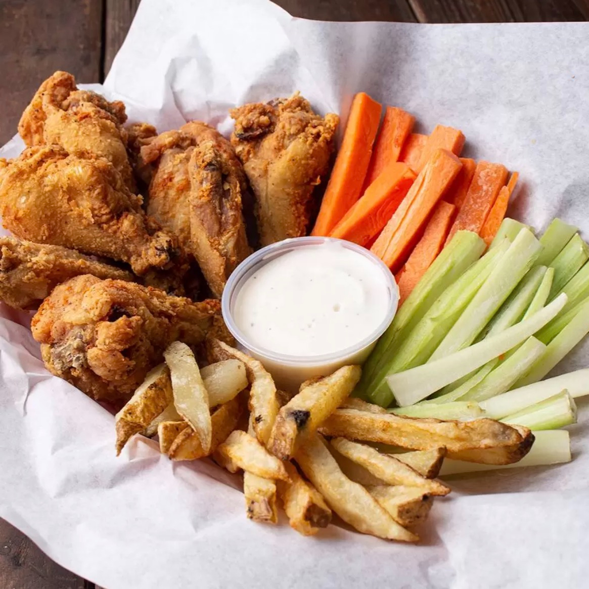 8 piezas de alitas bañadas en la salsa de tu preferencia, acompañadas de zanahoria, apio y ranch.