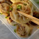 Orden de 6 dumpling acompañados de salsa original y decorados con cebollita verde.