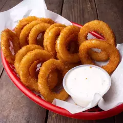Orden de aros de cebolla empanizados y se pueden acompañar de ranch.