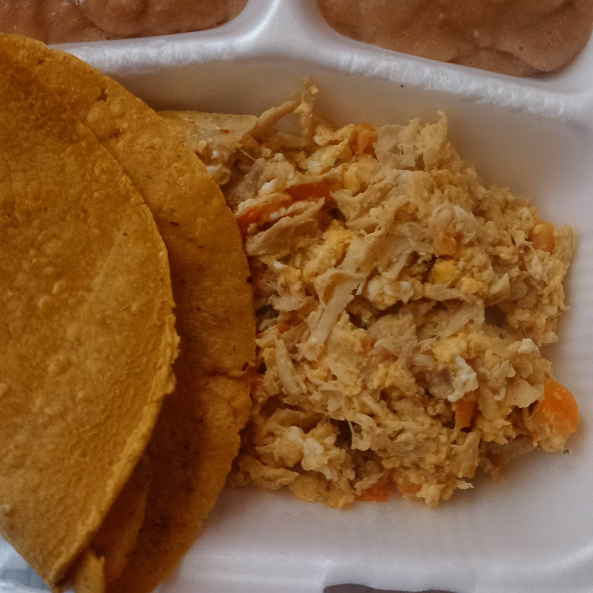 Huevo revuelto con Machaca de Pollo. Acompañado de Frijoles y dos Tortillas de Maiz.