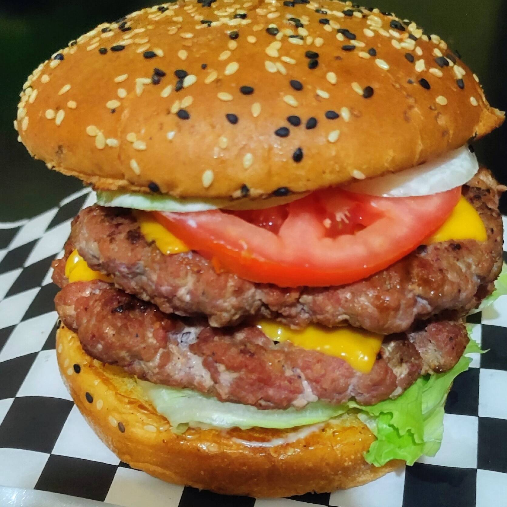 Doble carne con queso lechuga tomate,cebolla,tocino y pan con mayonesa y catsup y orden de papas fritas y catsup