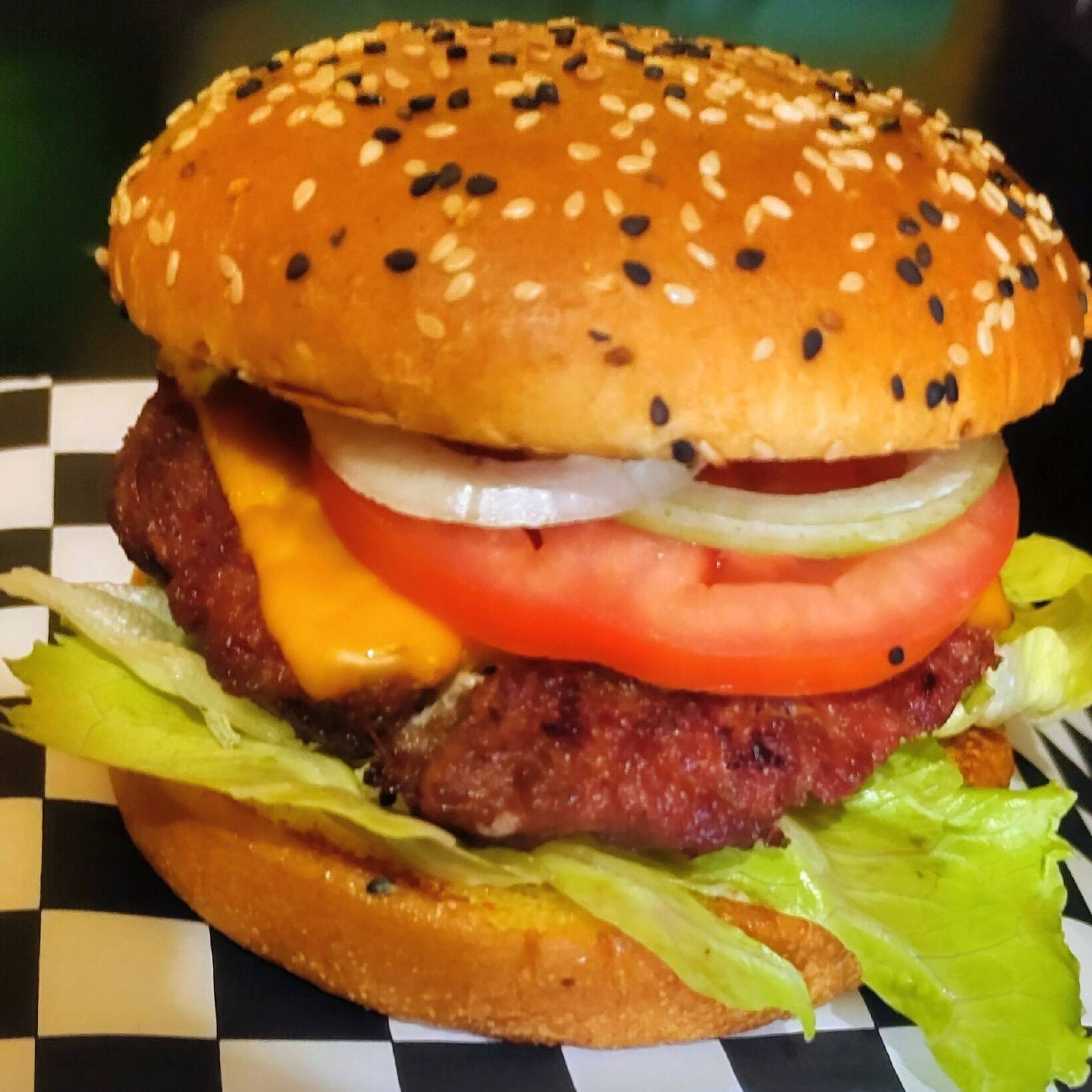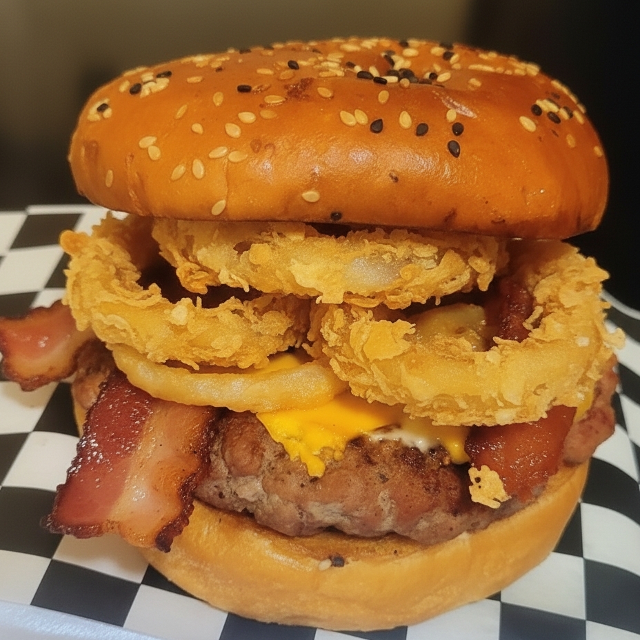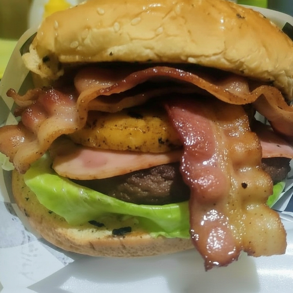 Carne con queso tocino frito o semi dorado ,aros de cebolla,cebolla dorada lechuga y pan con mayonesa y catsup y orden de papas fritas y catsup