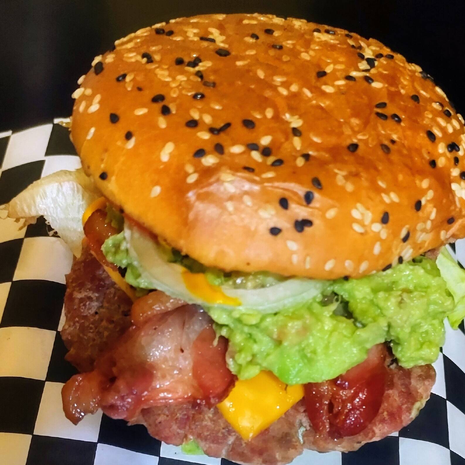 Carne con queso guacamole,tocino,lechuga,tomate,cebolla y pan con mayonesa y catsup con orden de papas fritas y catsup