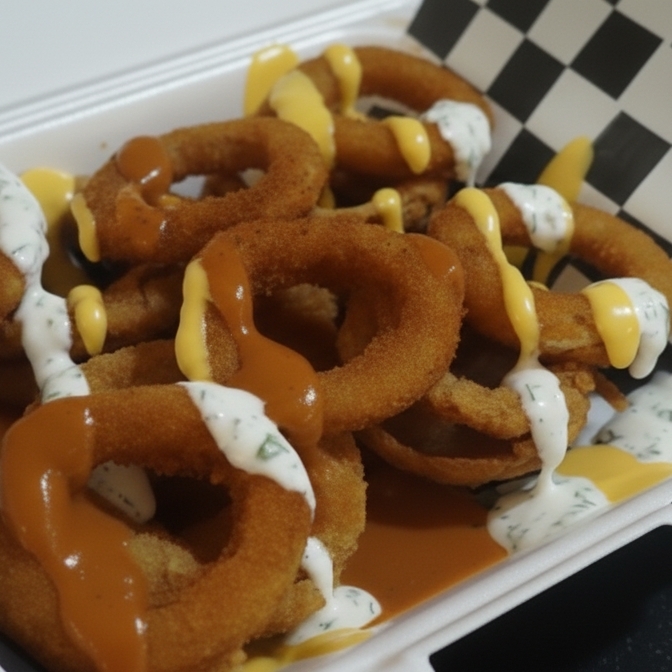 Orden de aros de cebolla empanizados con aderezos 2oz catsup