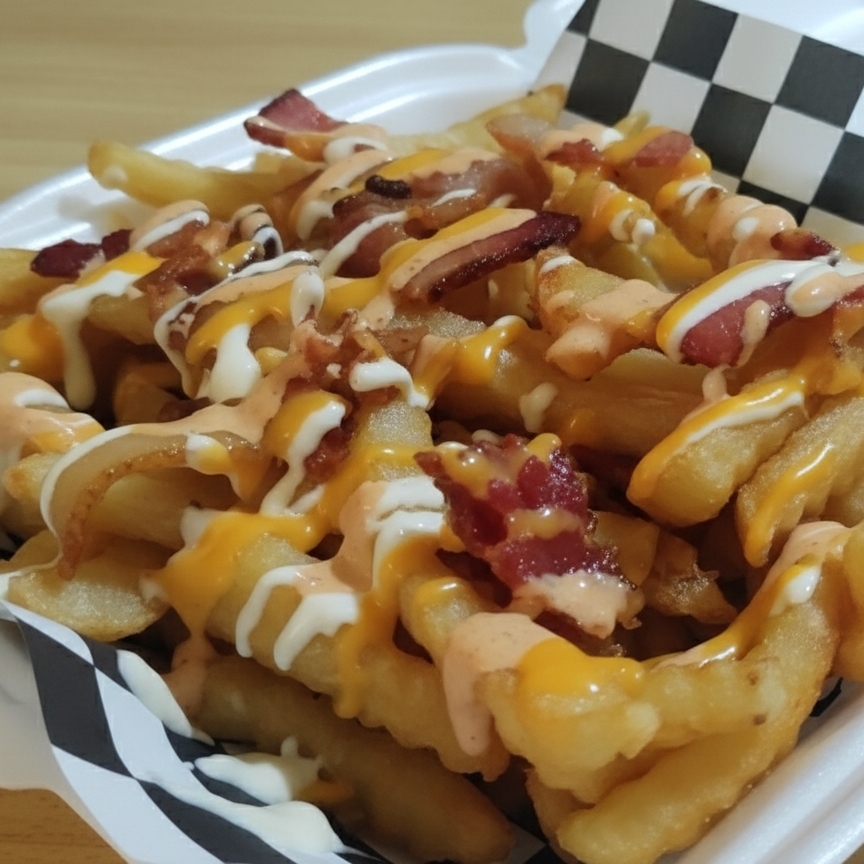 Papas fritas con tocino queso mayonesas y catsup 2oz catsup