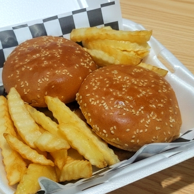 Dos carnes medianas con queso y su pan catsup ,mayonesa, mostaza con papas