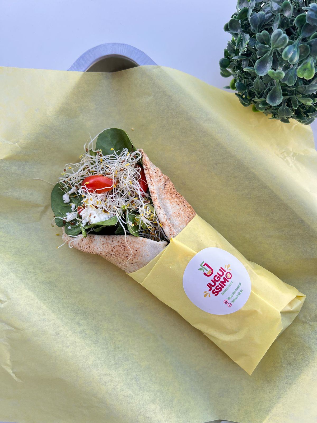 Pan pita, mezcla de huevo cocido con yogurt griego sin azúcar, mostaza y cebollín, espinaca fresca, morrón verde, tomate cherry, alfalfa, queso feta y chile quebrado.