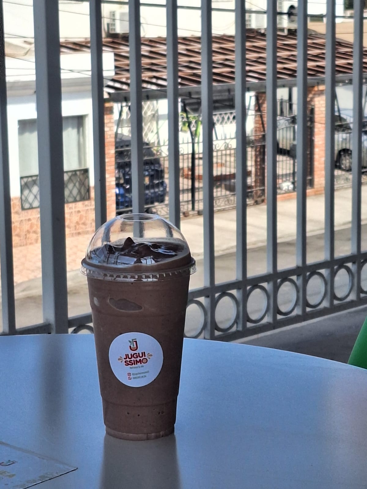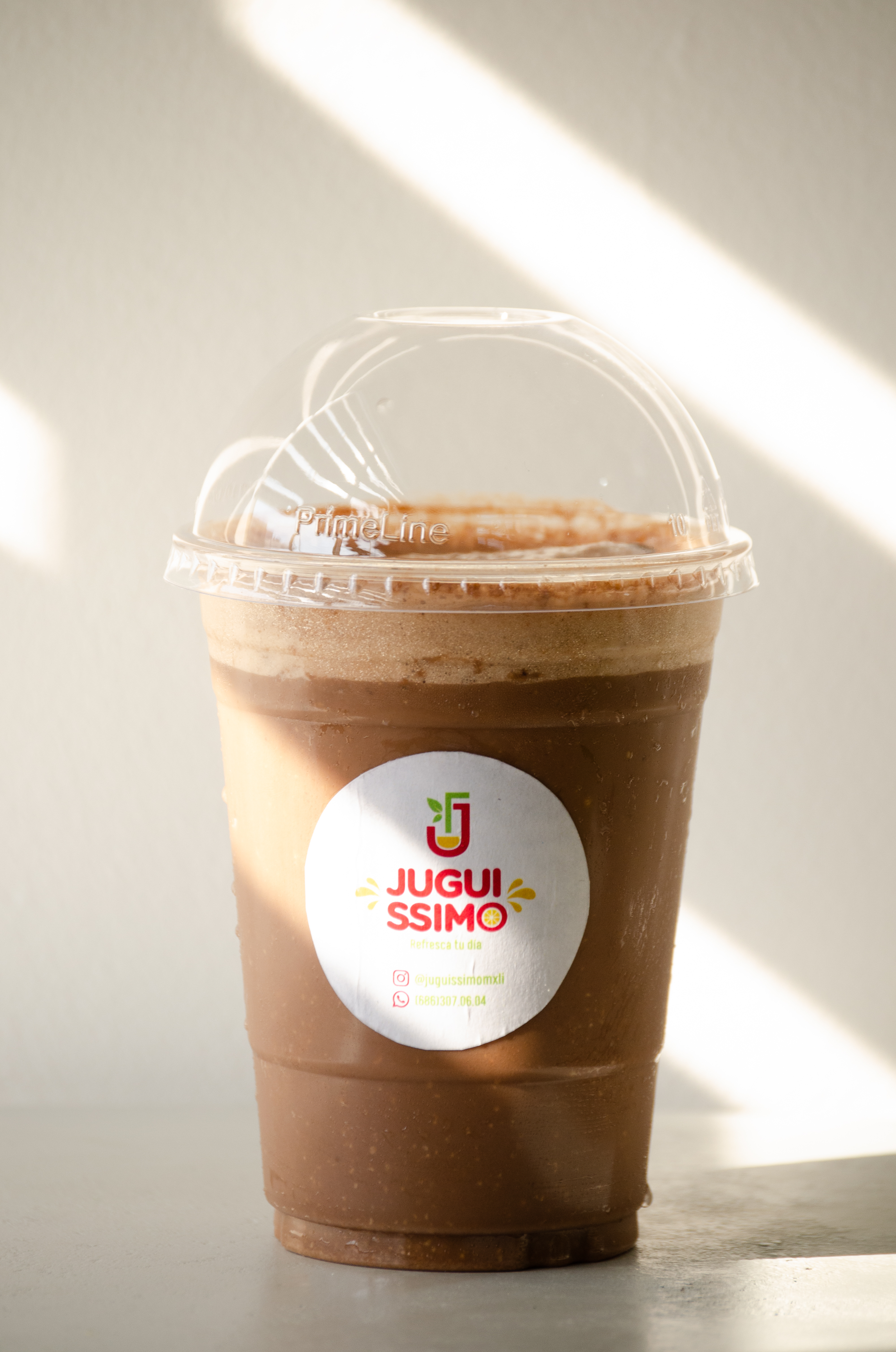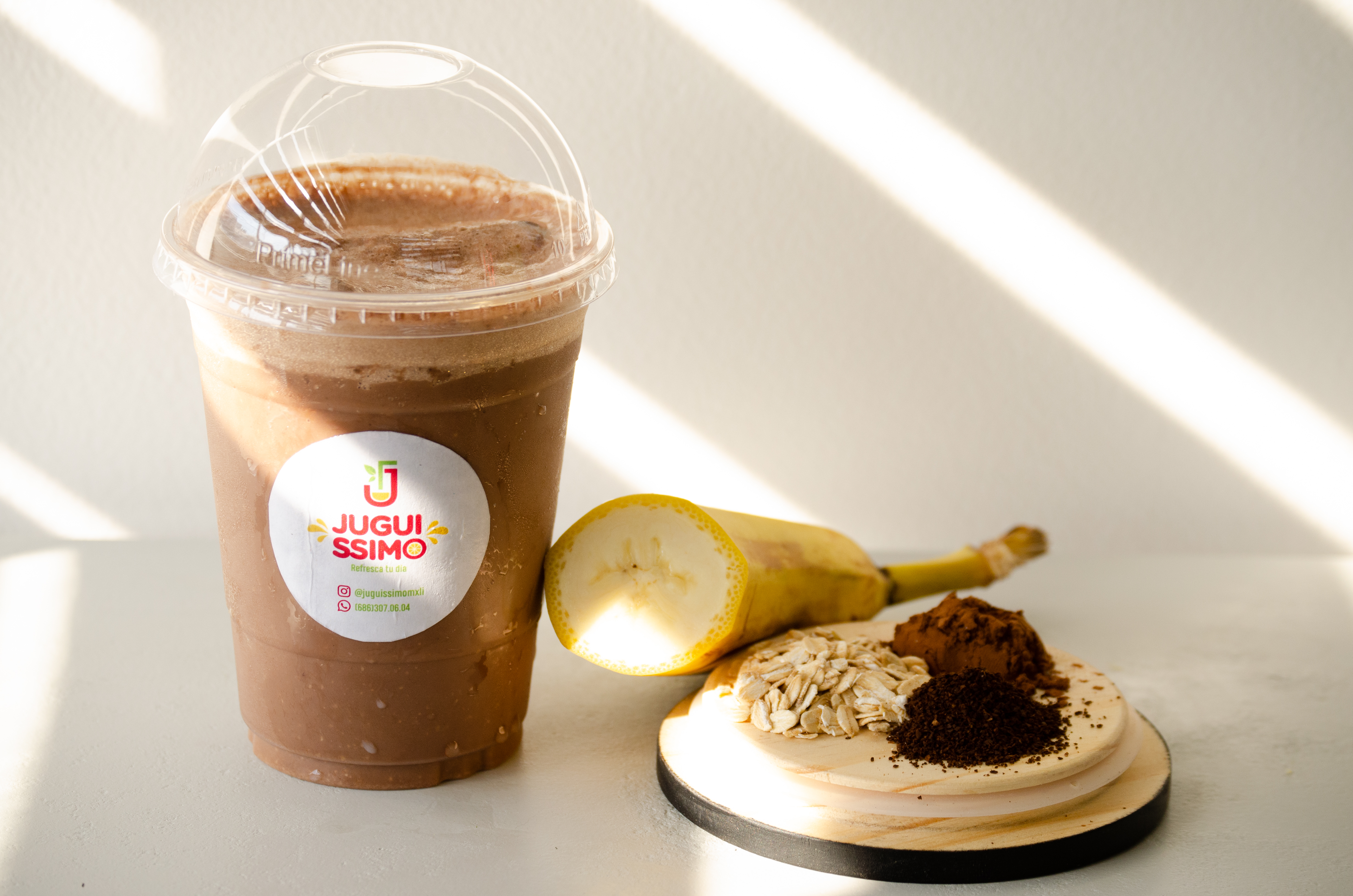 Licuado con leche, cocoa, avena, plátano y shot de espresso.