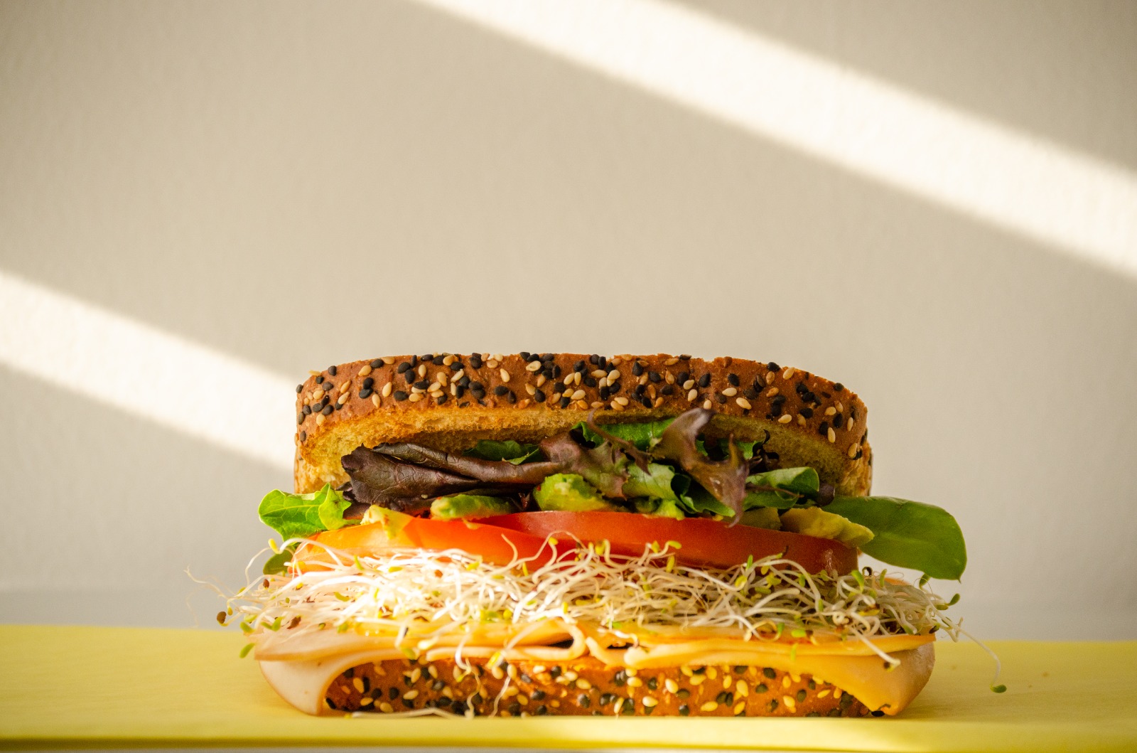 Pan de doce granos, pechuga de pavo, mostaza, queso, alfalfa, tomate, aguacate y mix de lechuga.
